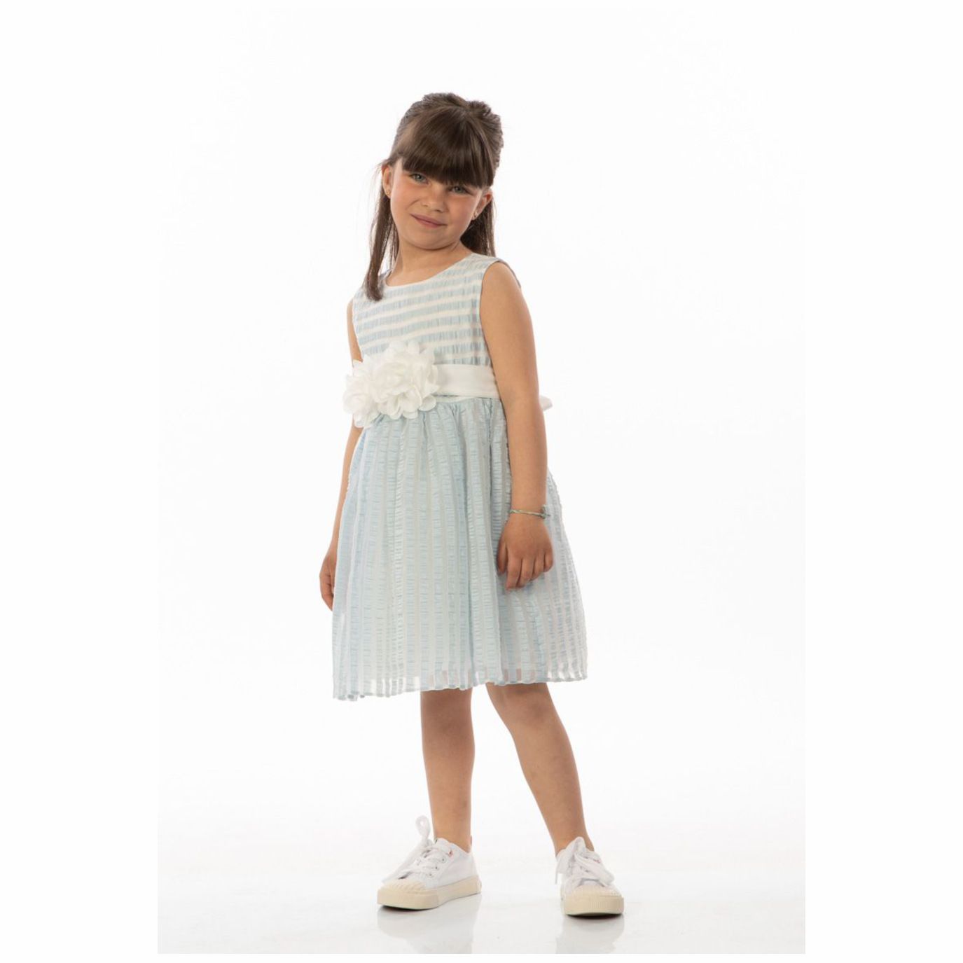 Abito di colore cielo con cintura con fiore applicato, della linea Alice Pi bimba.