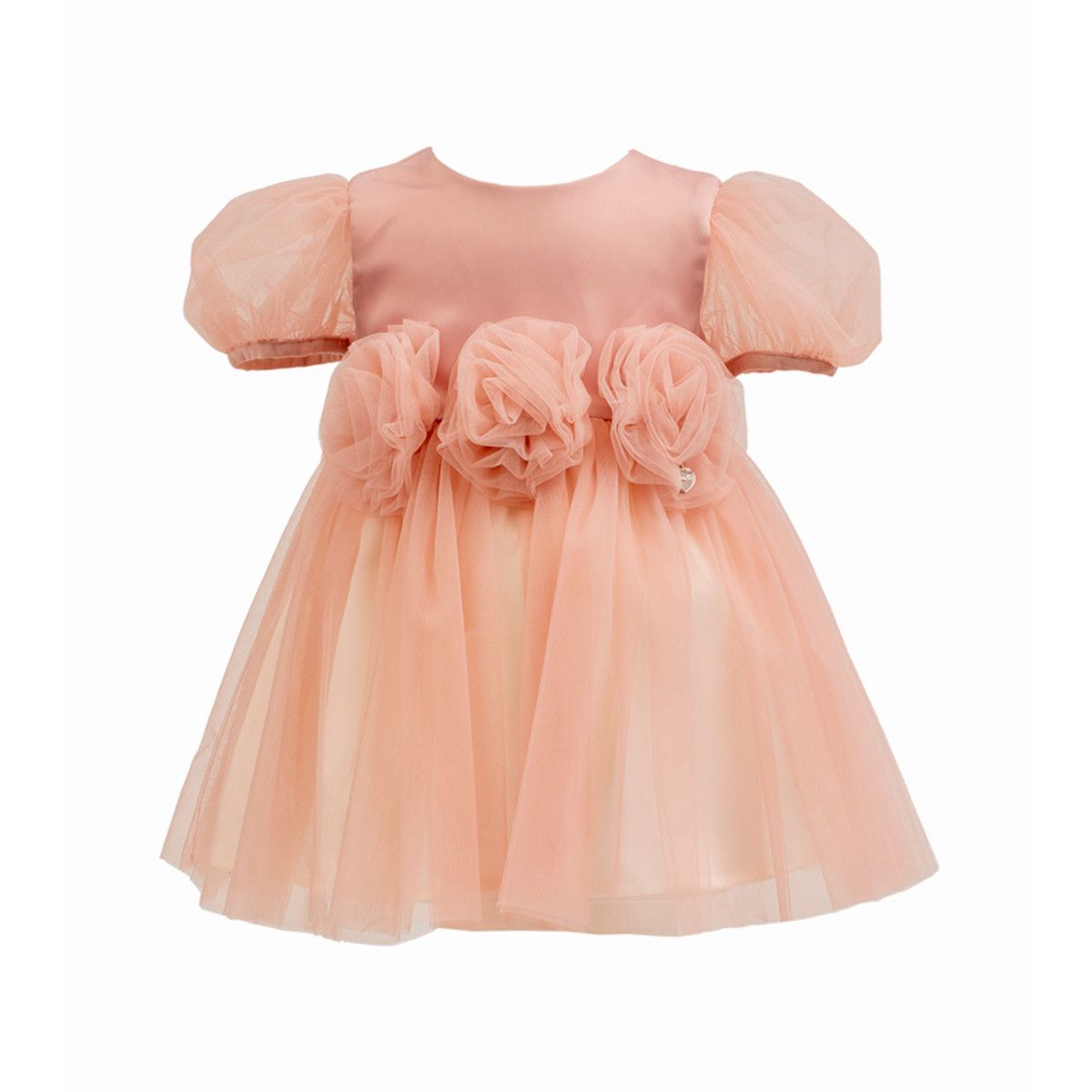 | Info Prodotto | Abito in tulle a mezza manica di colore rosa petalo, da bambina, della linea Alice Pi. |