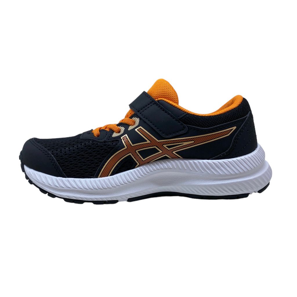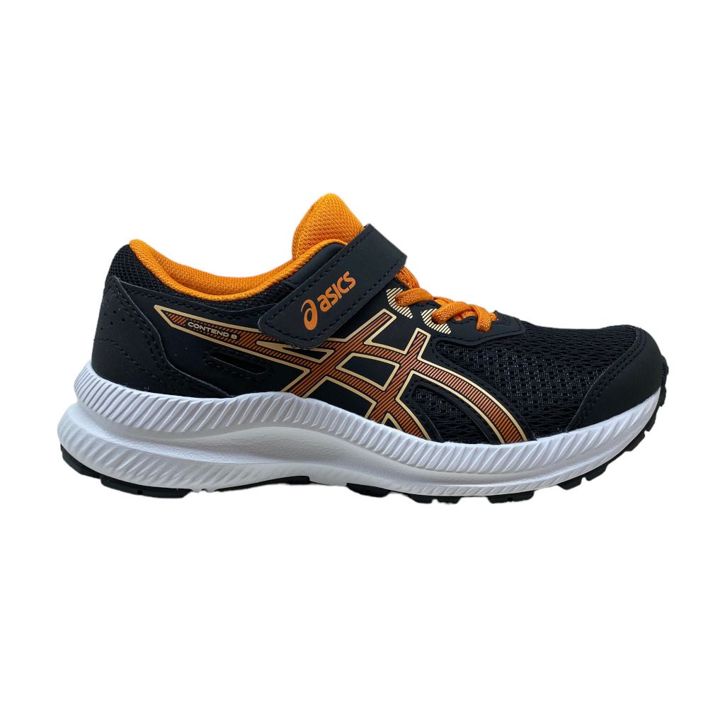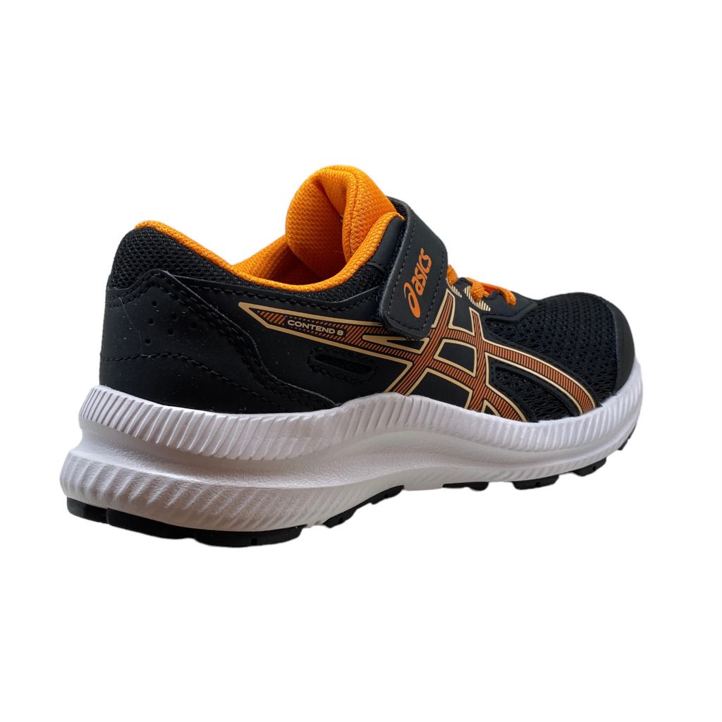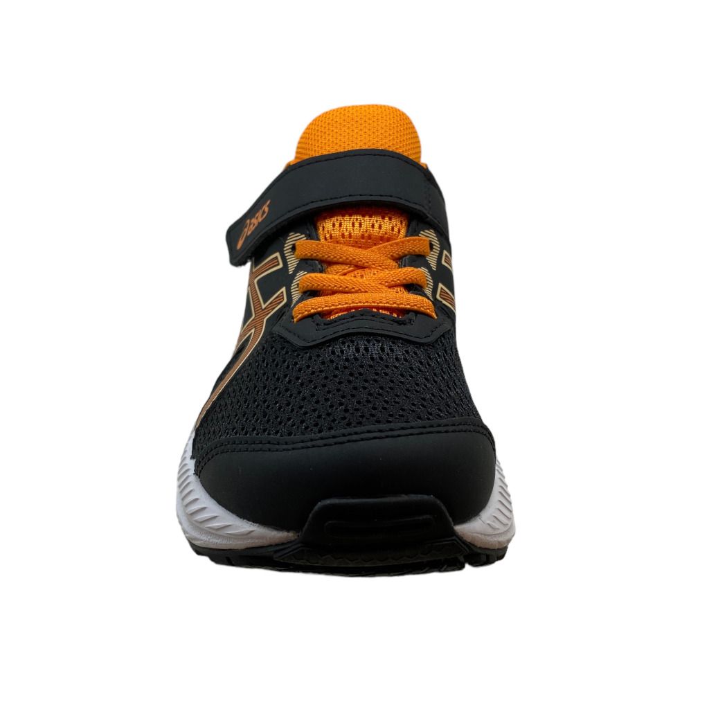 Scarpa con strappo della linea da bambino Asics. Un modello comodo in una bellissima combinazione di colori nero e arancio.