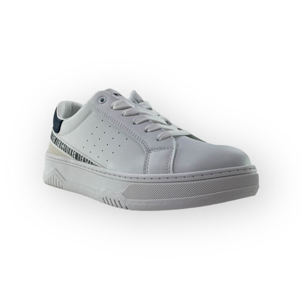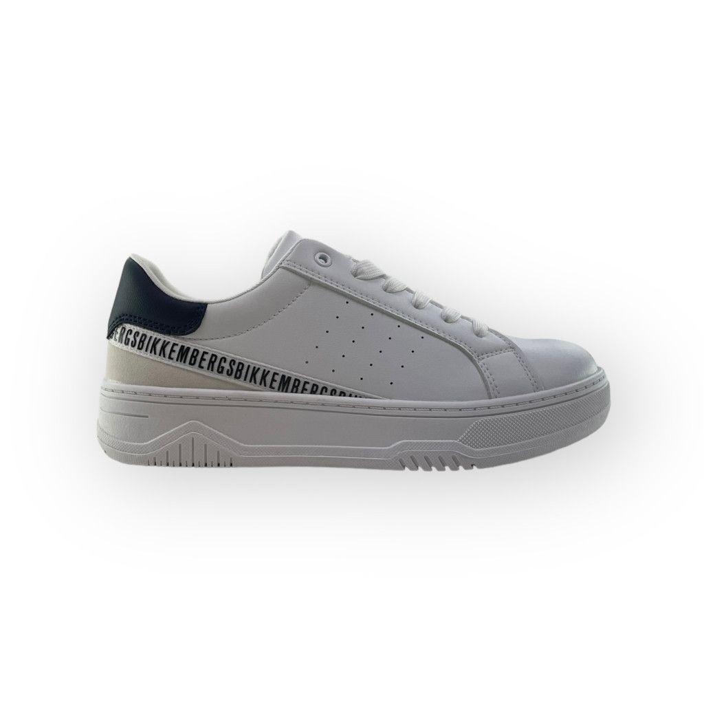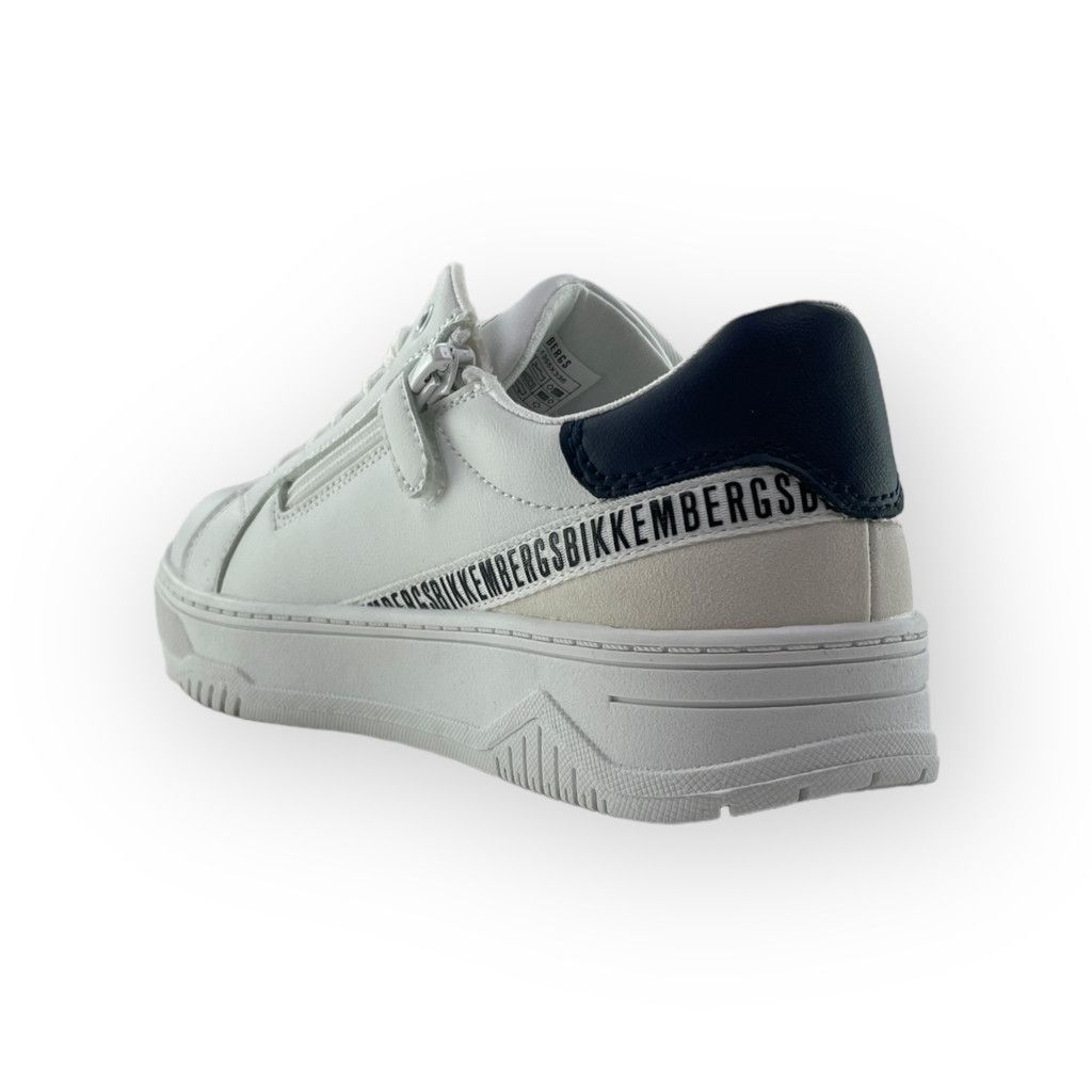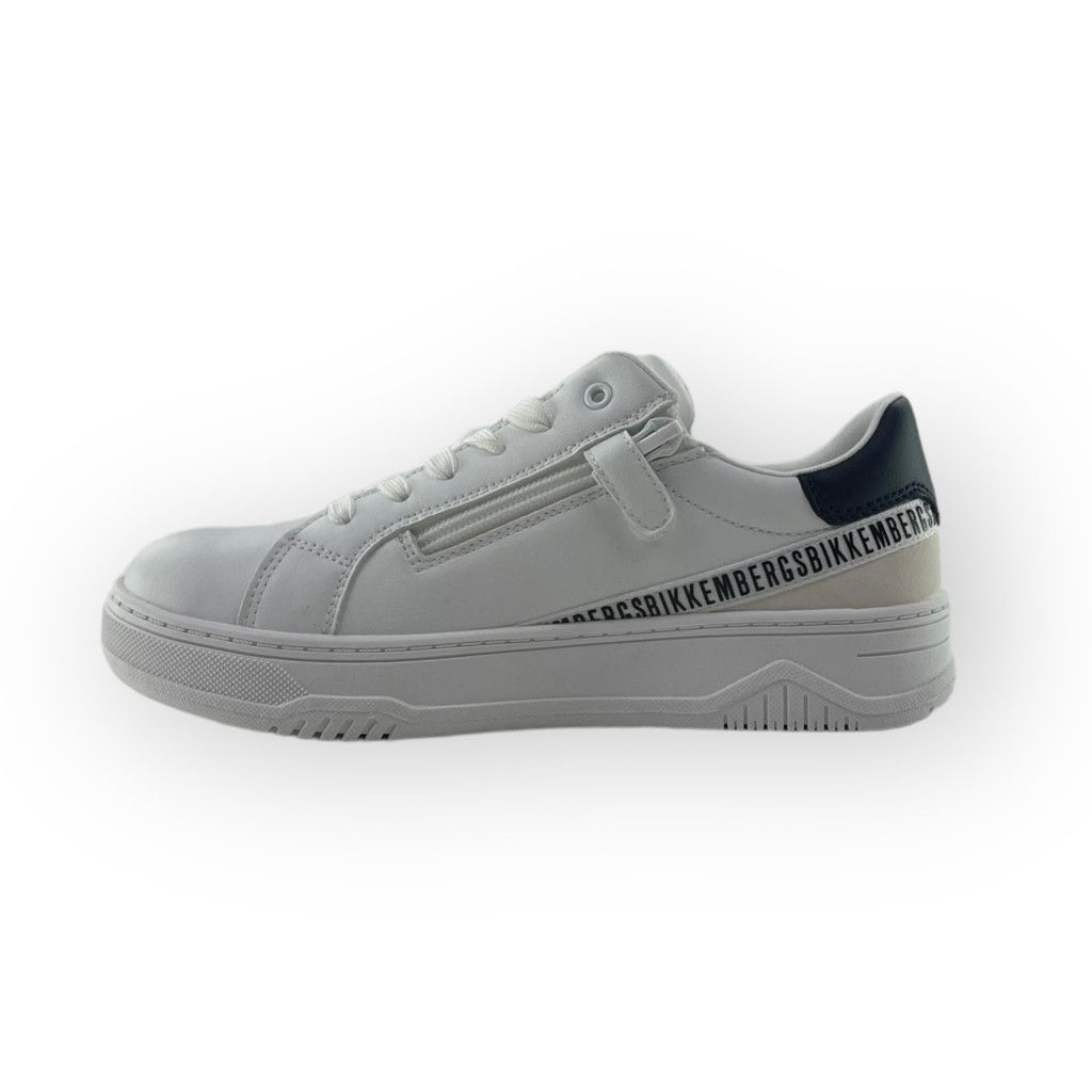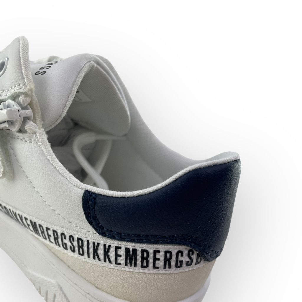 Scarpa allacciata della linea Bikkembergs bambino nel colore bianco con rifiniture blu.