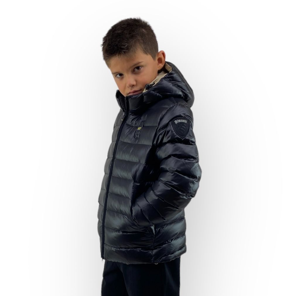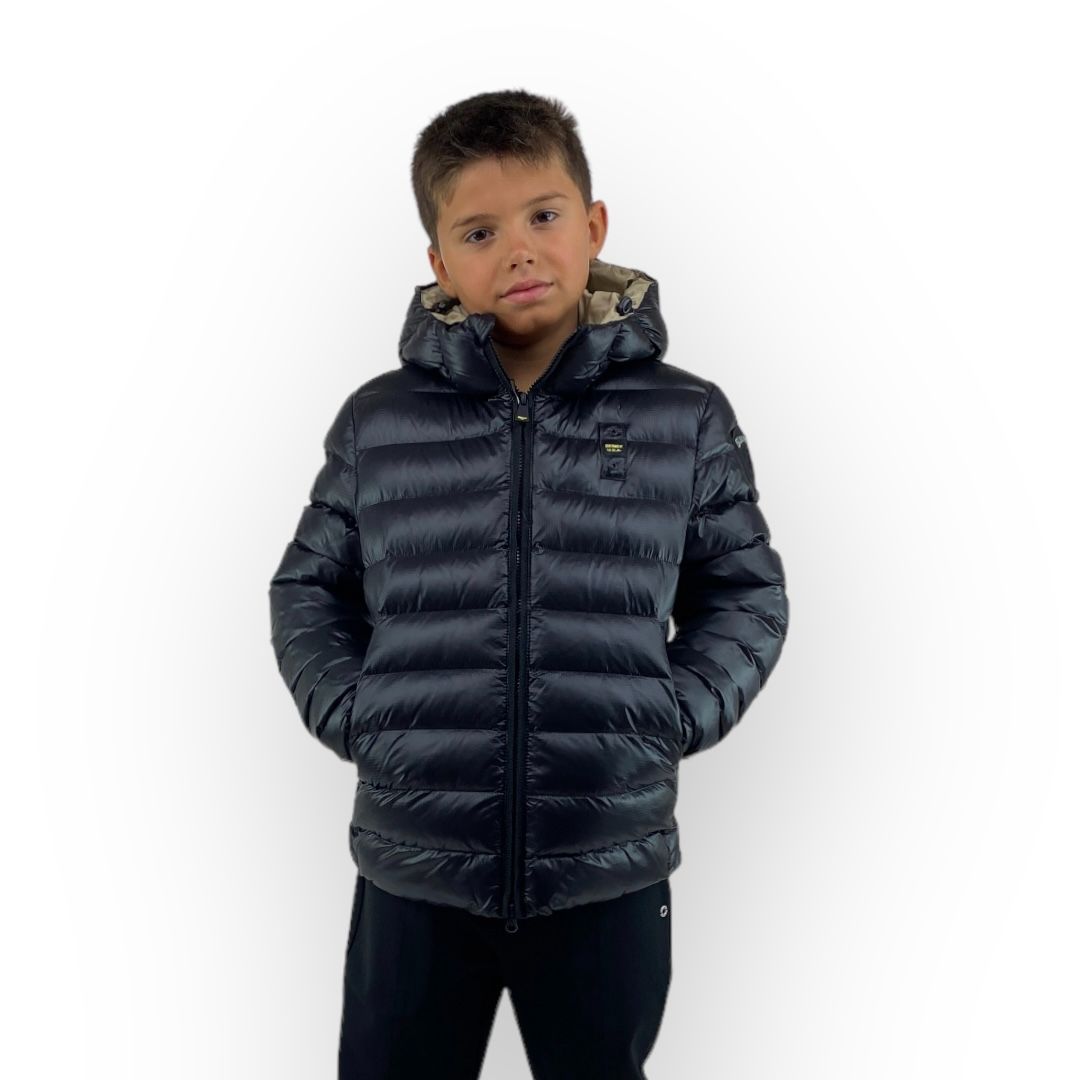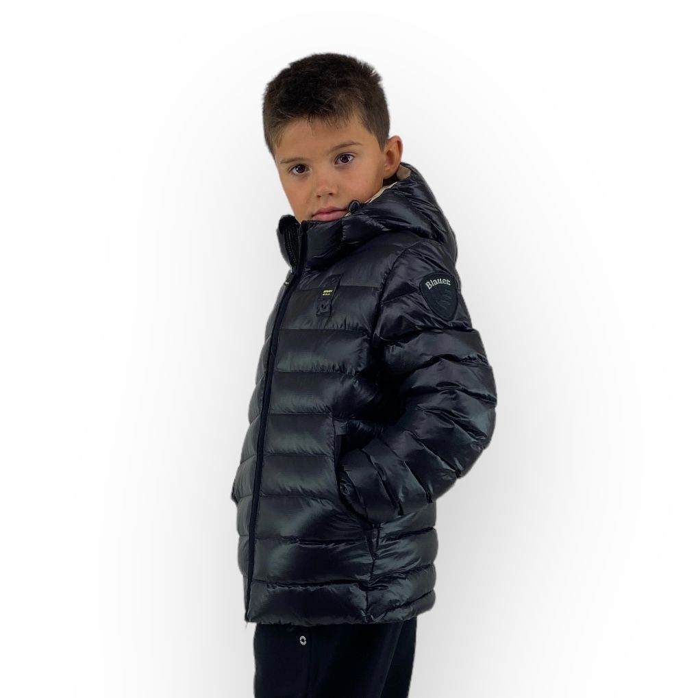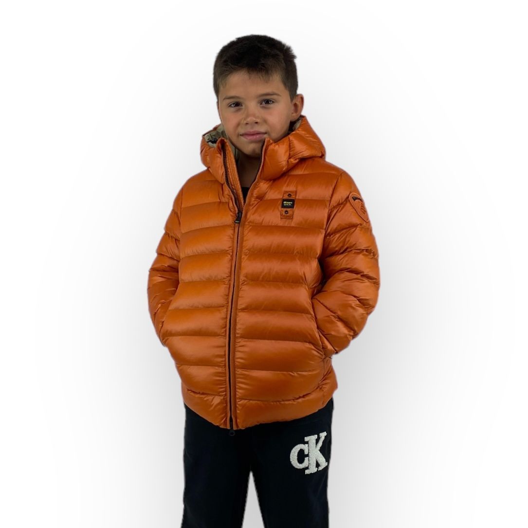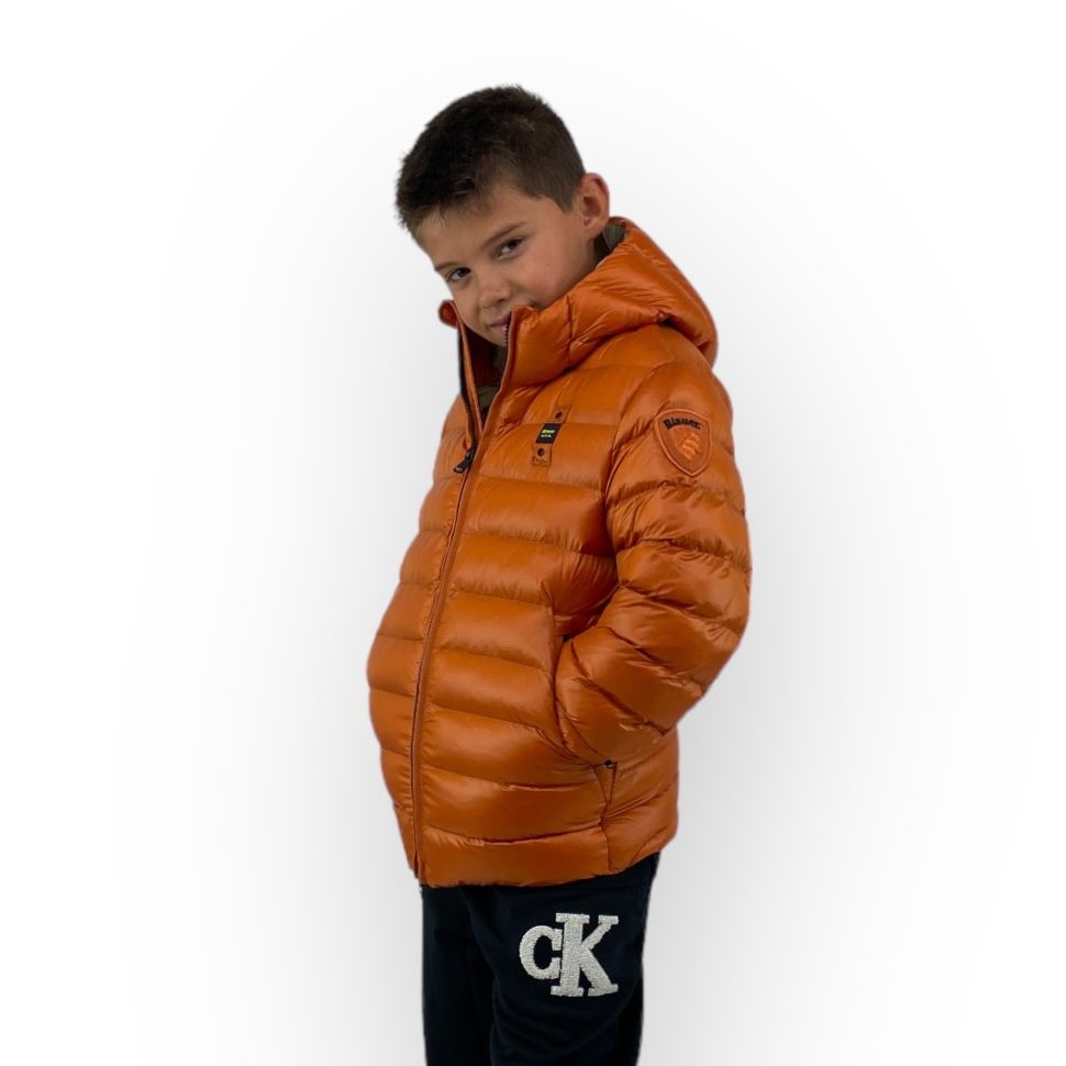 Piumino imbottito in ovatta, nei colori nero con interno beige, arancio con interno beige e blu con interno cielo, della linea Blauer bimbo.