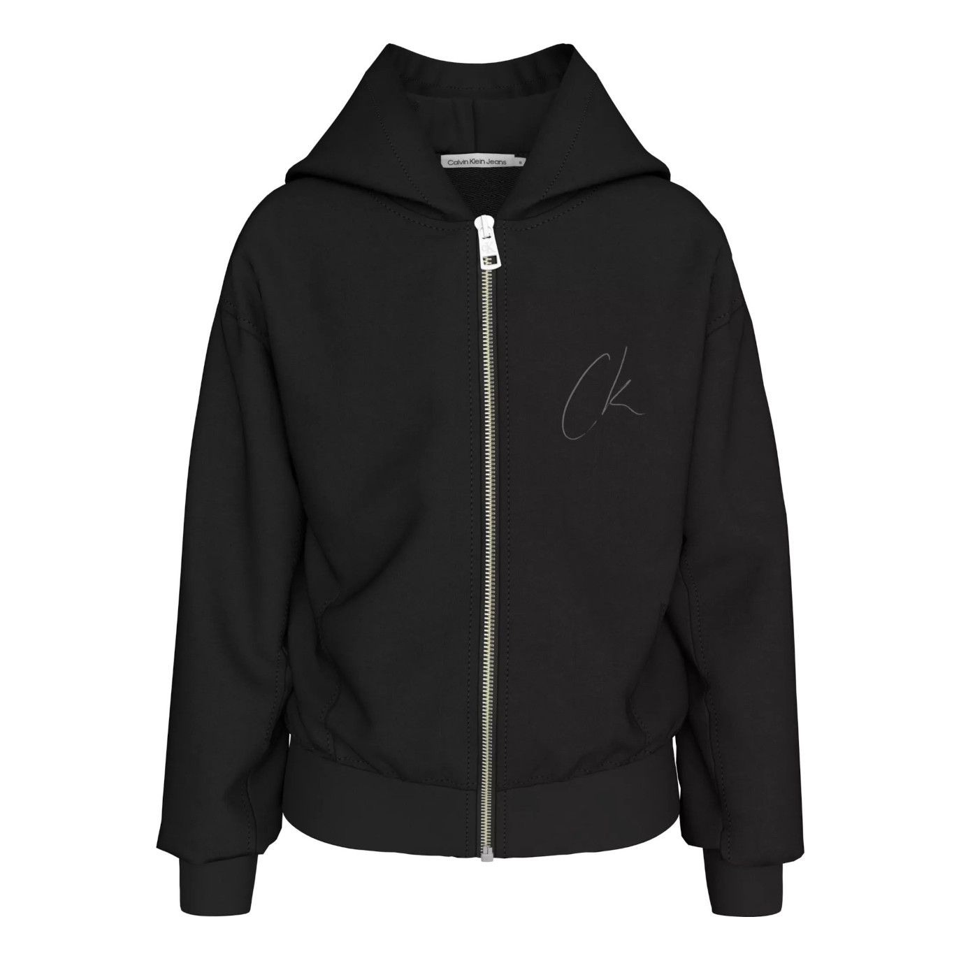Felpa con zip di colore nero con logo bianco da bambina della linea Calvin Klein.