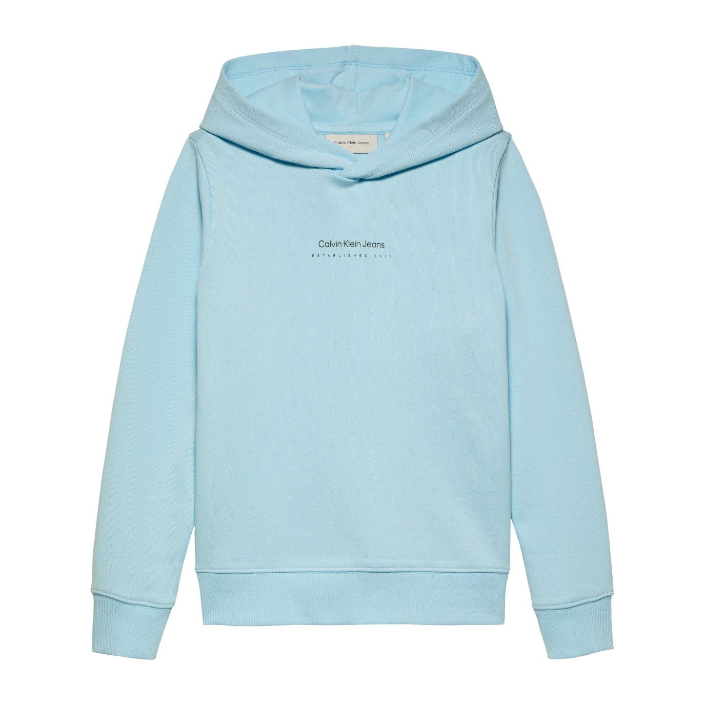 Felpa chiusa con cappuccio di colore celeste con stampa sul dietro della linea Calvin Klein.