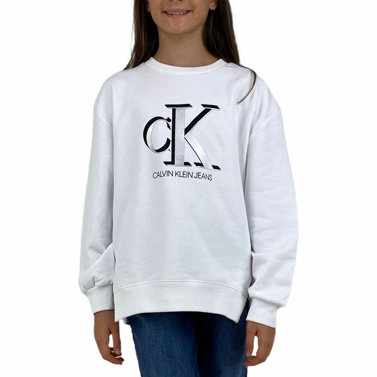 Bellissima felpa girocollo della collezione Calvin Klein bambina. Una maglia che grazie ai suoi dettagli risulta unica. Spacchi laterali e il logo sul davanti fanno la differenza.nnMATERIALE: 100% cotone.