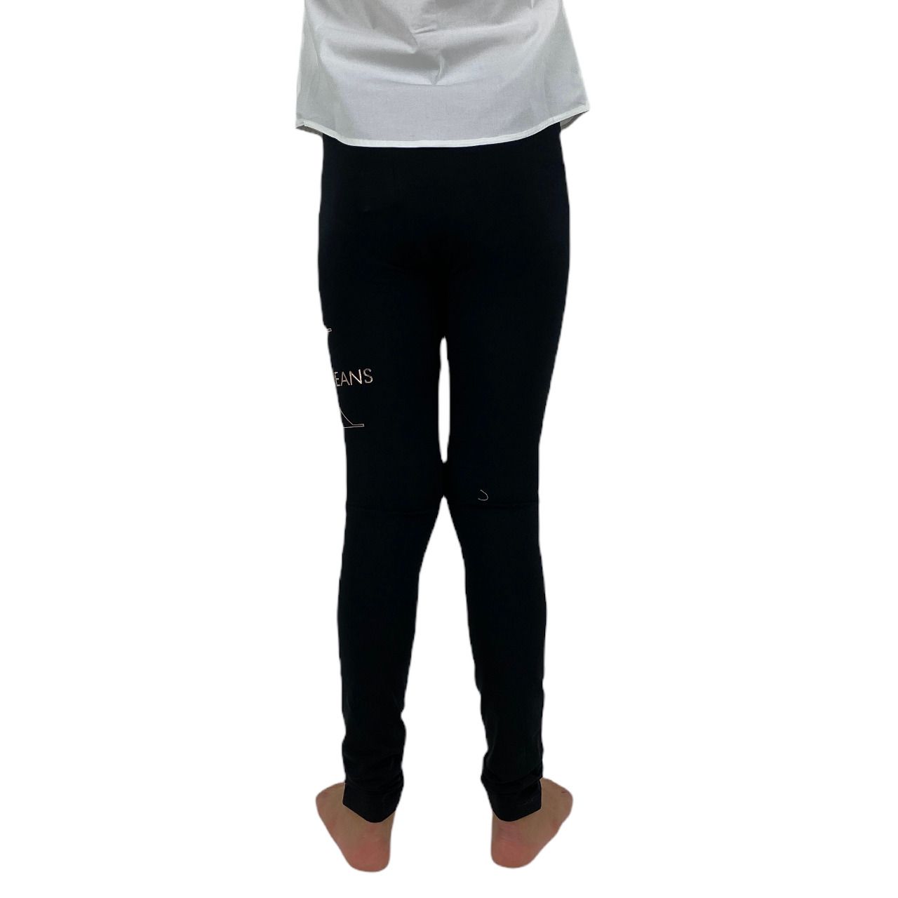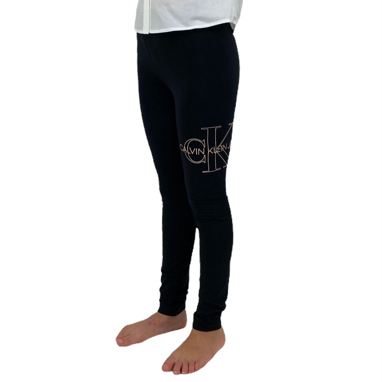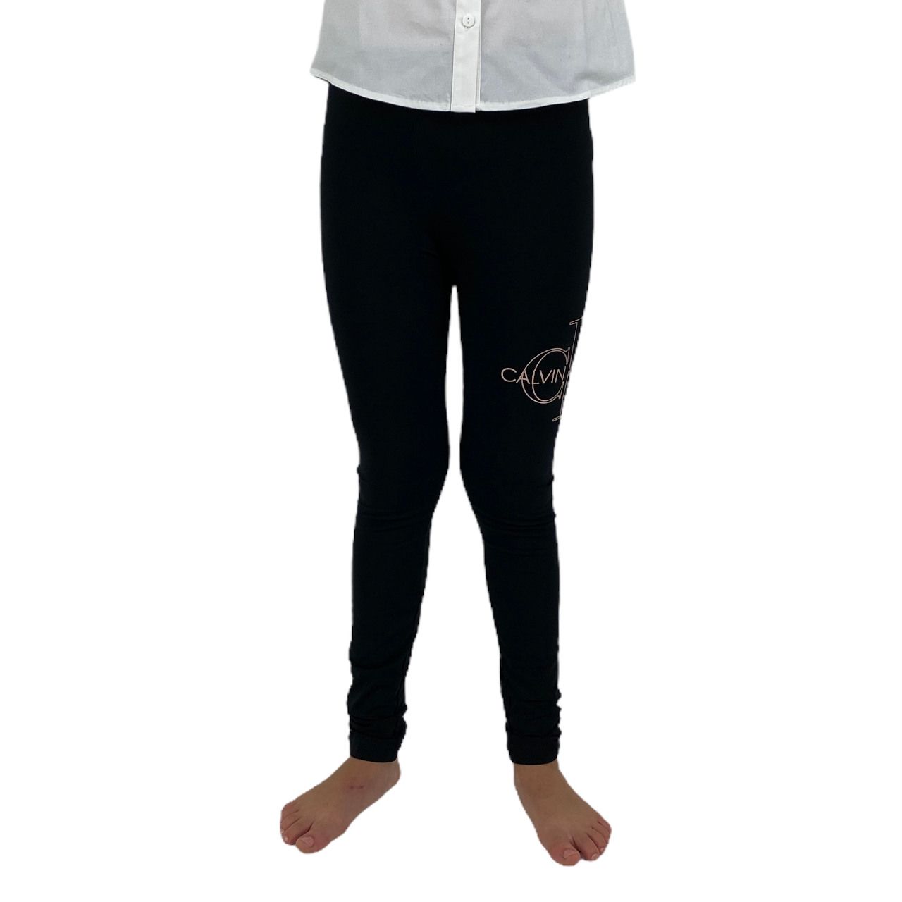Leggings nero con logo Calvin Klein color bronzo. Perfetto per gli outfit sportivi di tutte le bambine.nnMATERIALE: 94% cotone, 6% elastane.