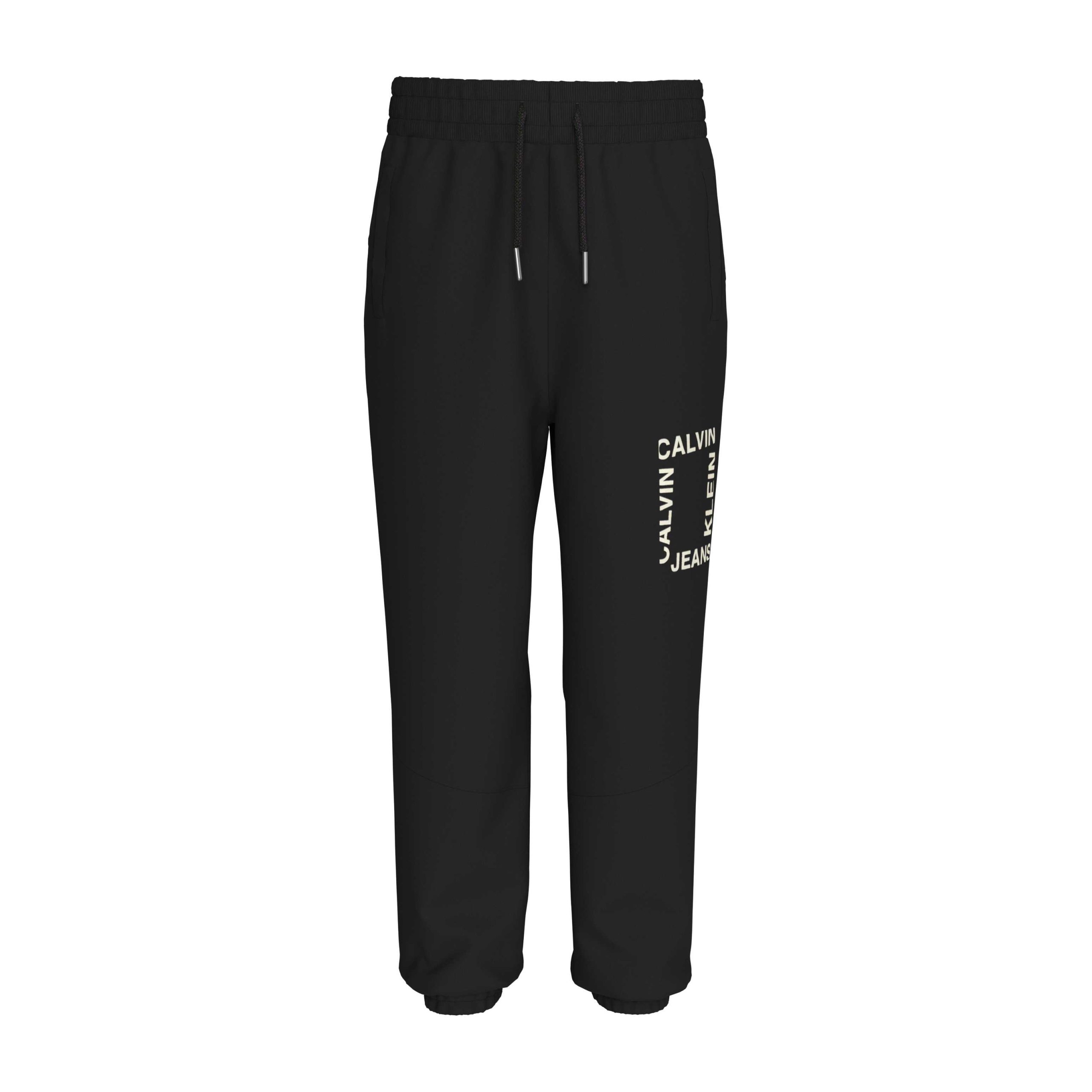 Pantalone in felpa nel colore nero con scritta laterale bianca della linea Calvin Klein.
