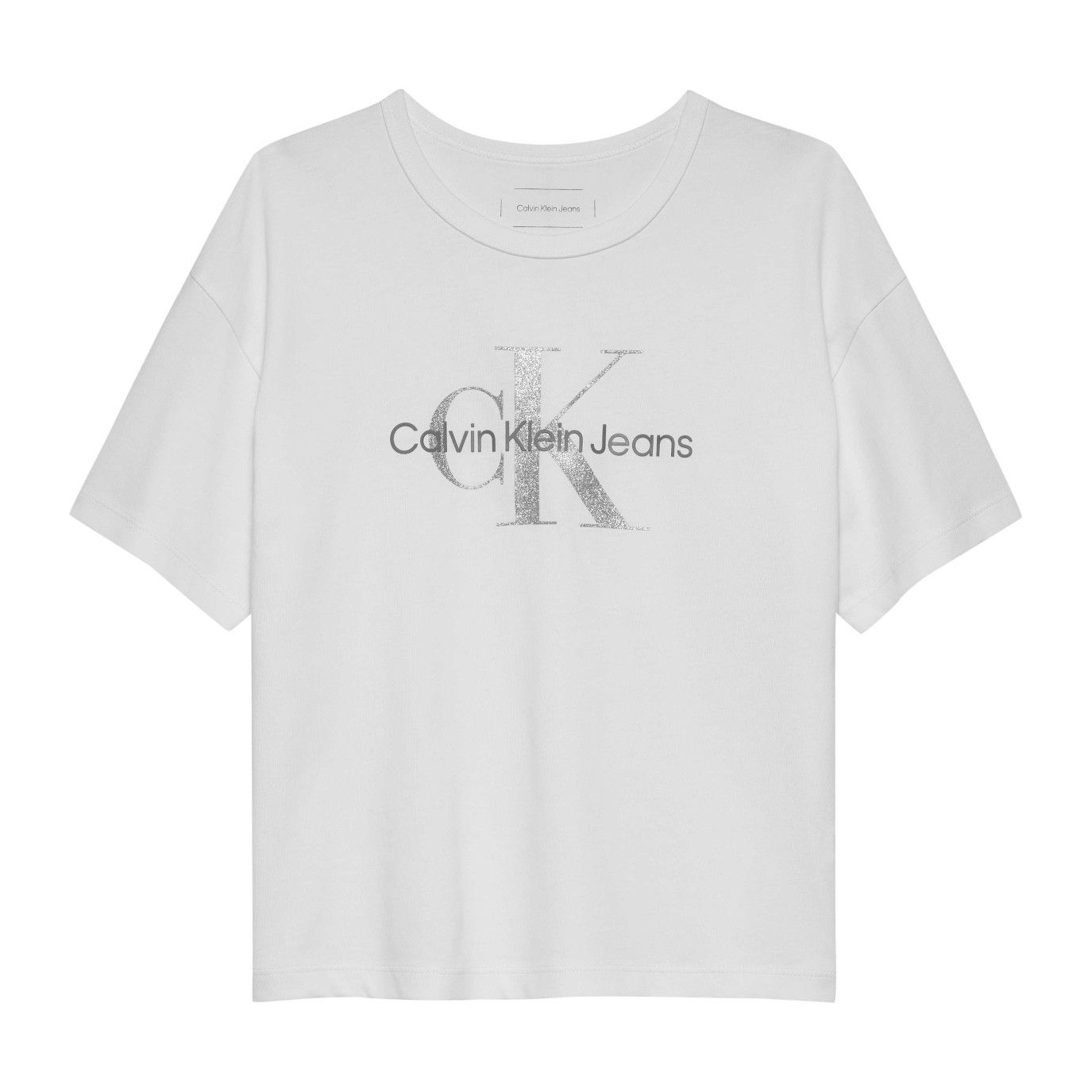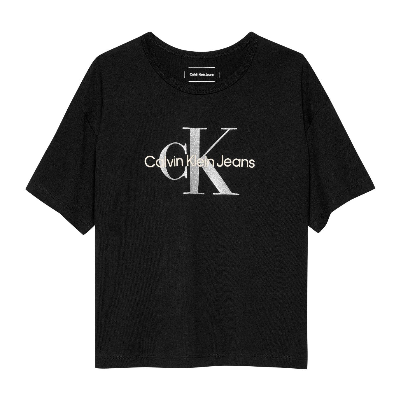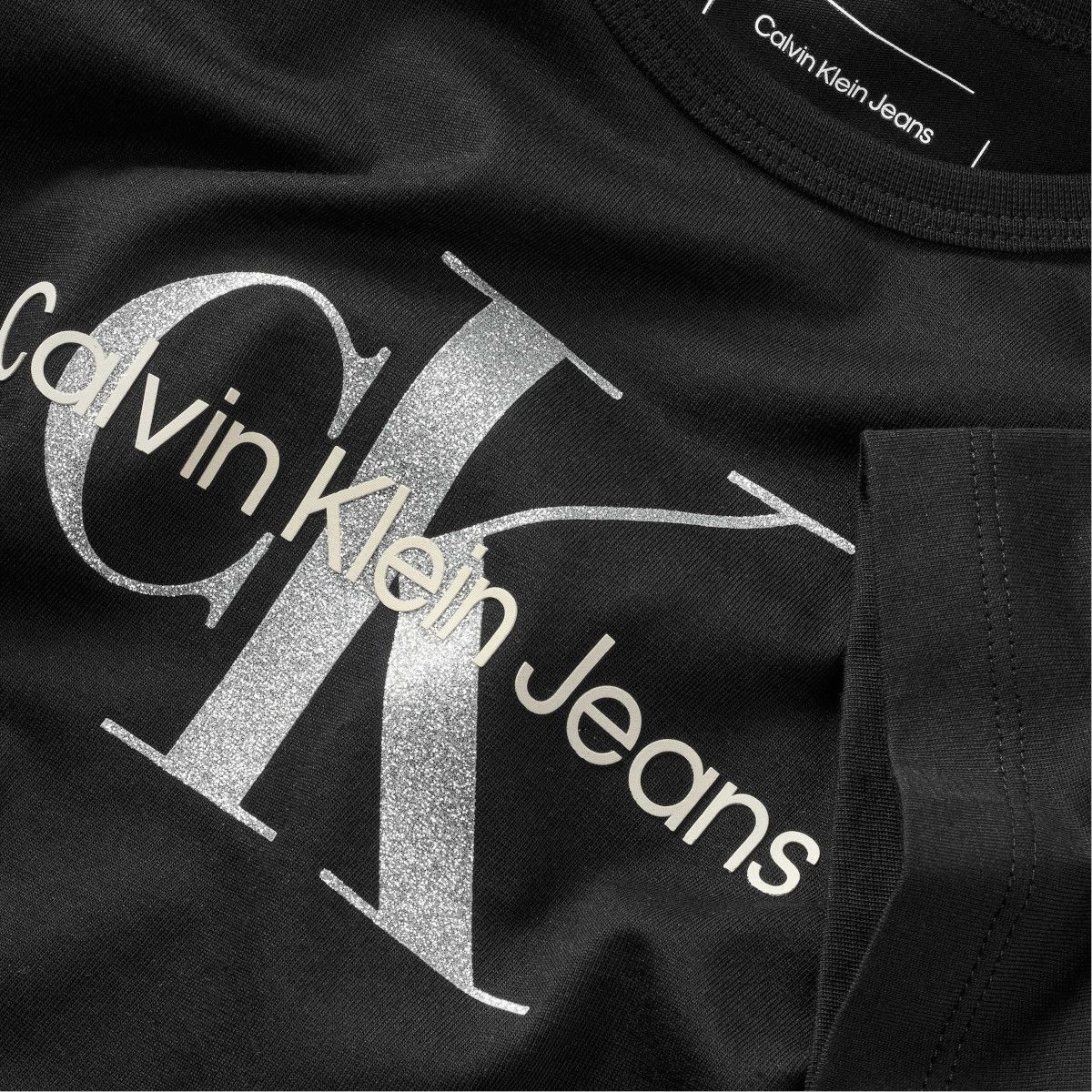 T-shirt manica corta nei colori bianca e nera con scritta argento da bambina della linea Calvin Klein.