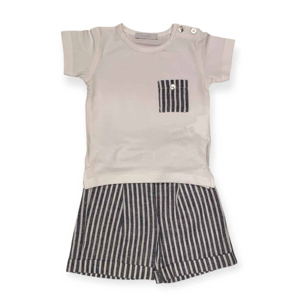 Il completo bambino Linea Coccodè è la scelta perfetta per vestire i più piccoli con uno stile fresco, pratico e curato nei dettagli. Composto da maglietta bianca a maniche corte e pantalone corto a righe bianche e blu, è ideale per la stagione primavera/estate.