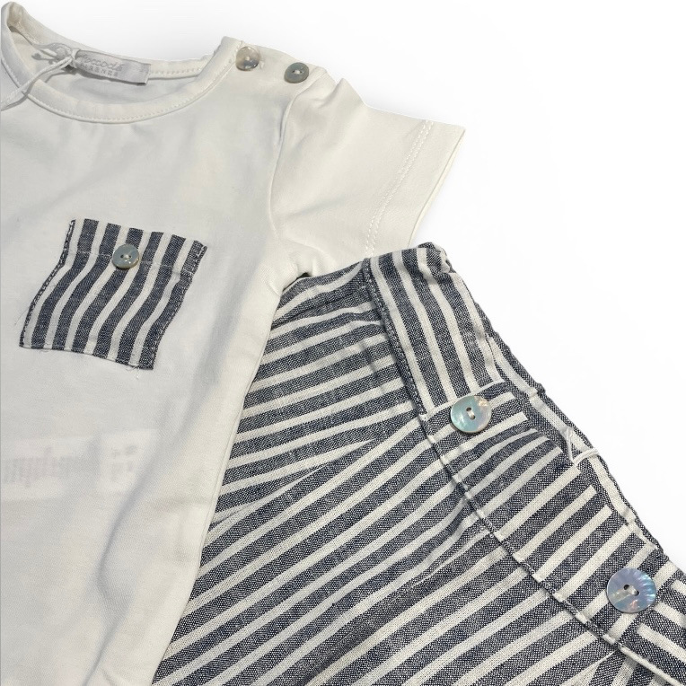La t-shirt bianca, realizzata in morbido cotone, è delicata sulla pelle e garantisce comfort e traspirabilità per tutta la giornata. Il pantaloncino corto a righe bianco e blu dona un tocco vivace e marinaro, perfetto per look casual ma sempre ordinati. La vestibilità è studiata per assicurare libertà di movimento ai bambini da 3 mesi a 3 anni.