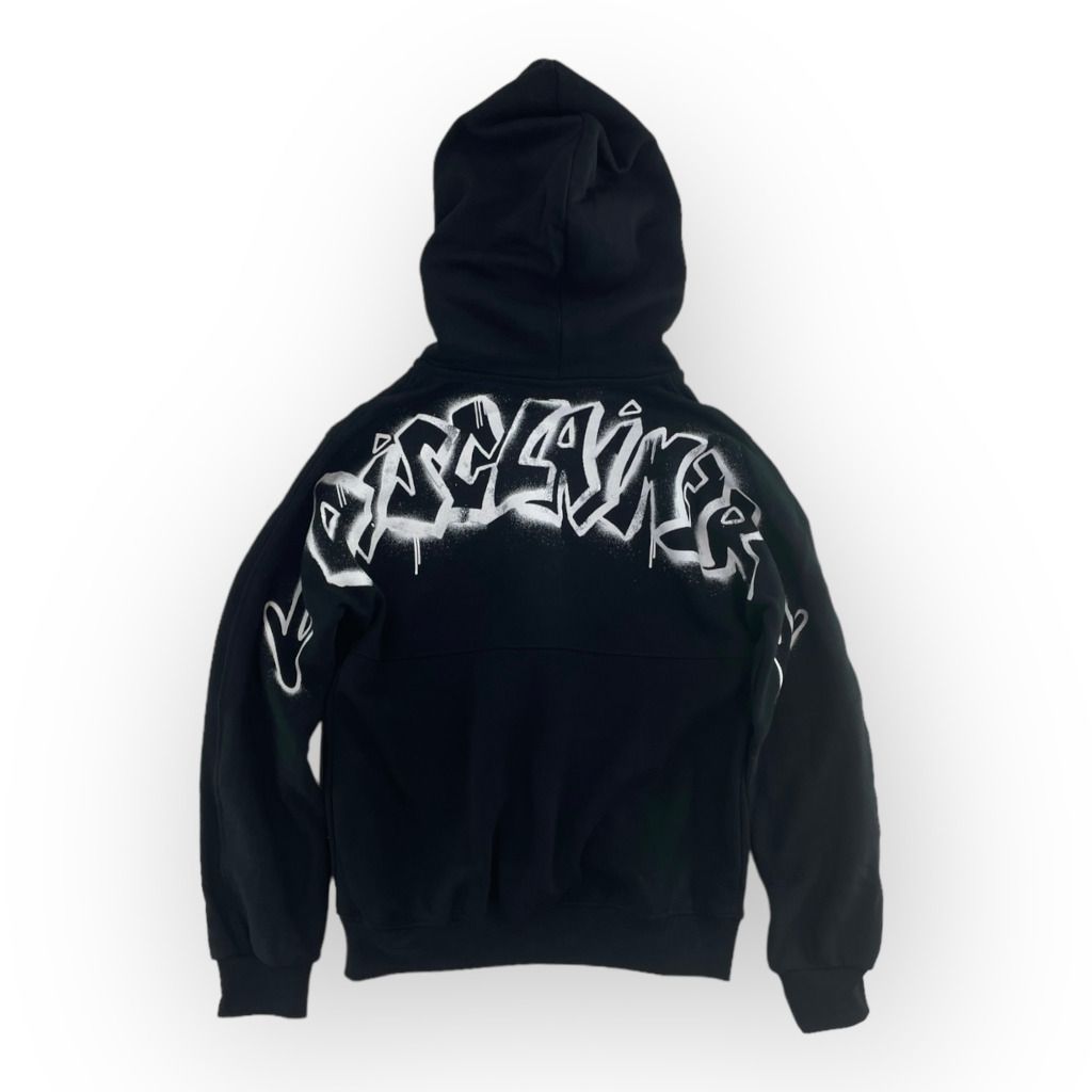 | Info Prodotto | Felpa zip aperta con cappuccio di colore nera con stampa dietro da bambino della linea Disclaimer. |