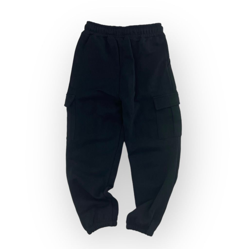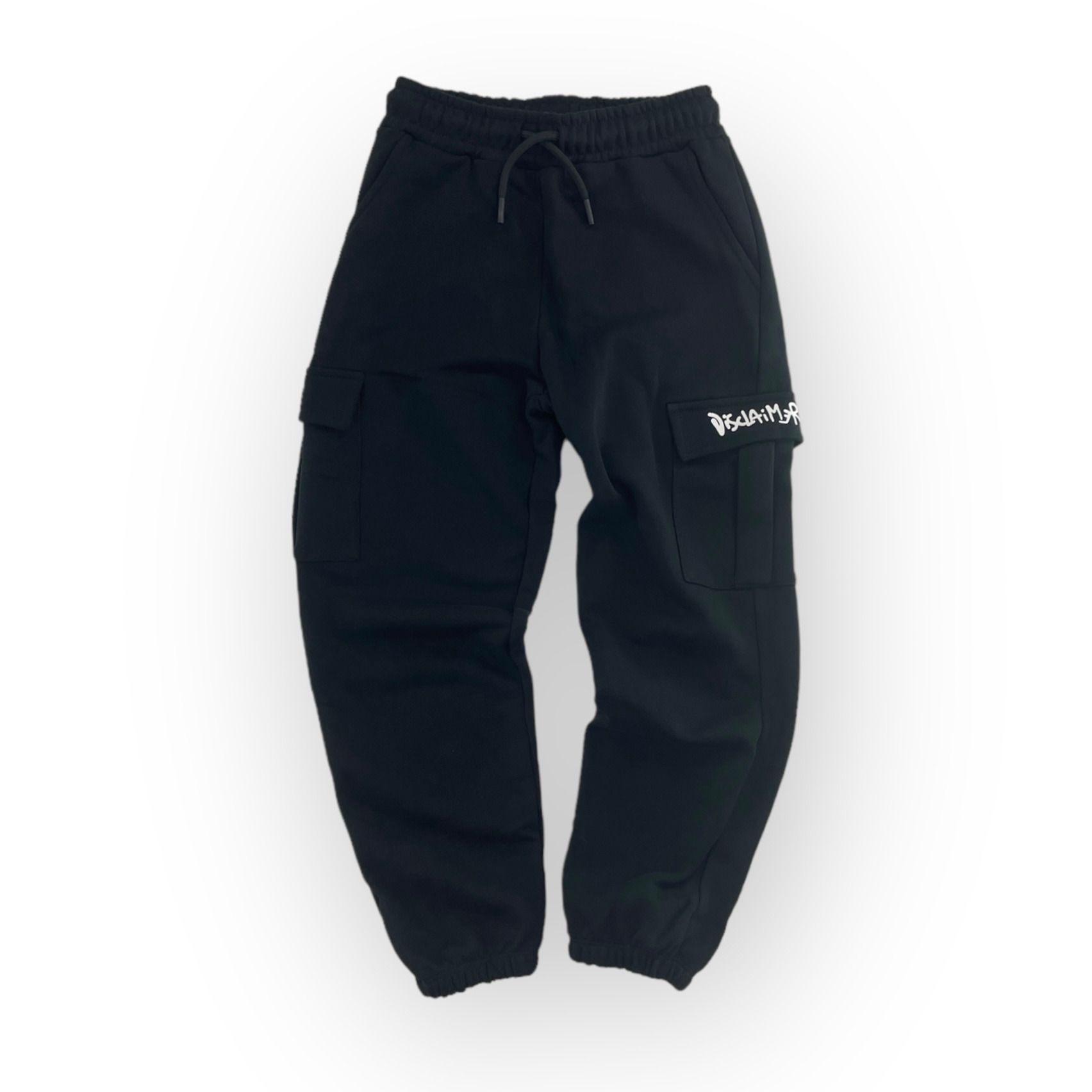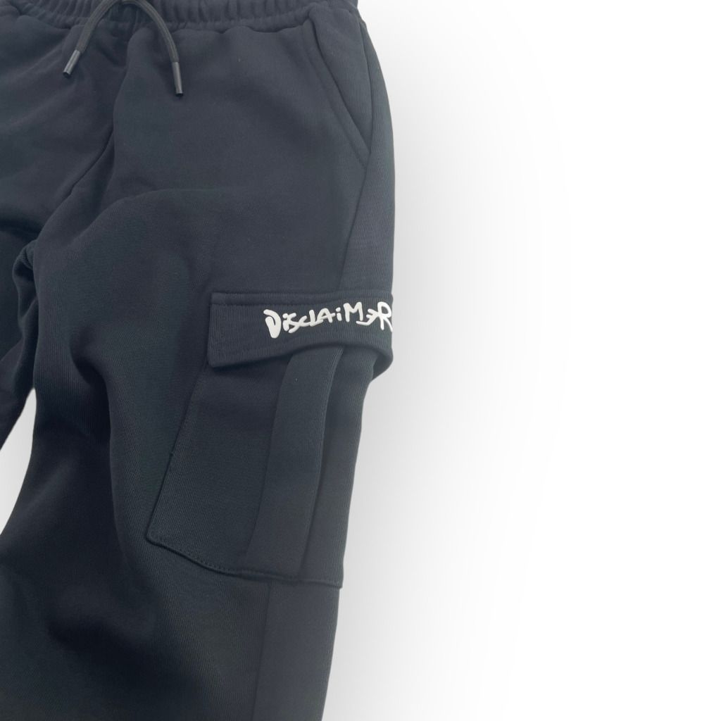 Pantalone in felpa di colore nero con tasconi e scritta piccola da bambino della linea Disclaimer.
