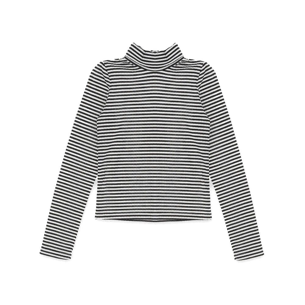 Maglia a collo alta in fantasia rigata bianca e nera. nnMATERIALE: 62% poliestere, 30% viscosa, 6% poliammide, 2% elastane.
