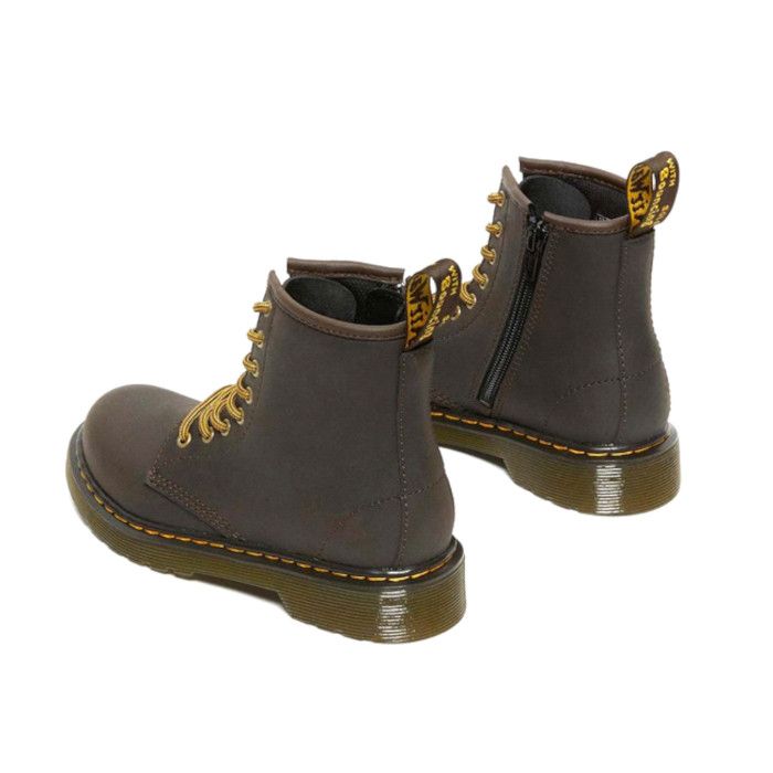 Per seguire la moda di questi tempi Dr. Martens ci presenta, nella linea bambino un grintoso anfibio marrone. Il laccio riprende la cucitura gialla e l’etichetta sul retro che da sempre contraddistingue il marchio. Per chi non si sente di osare troppo ล in dotazione il laccio marrone.