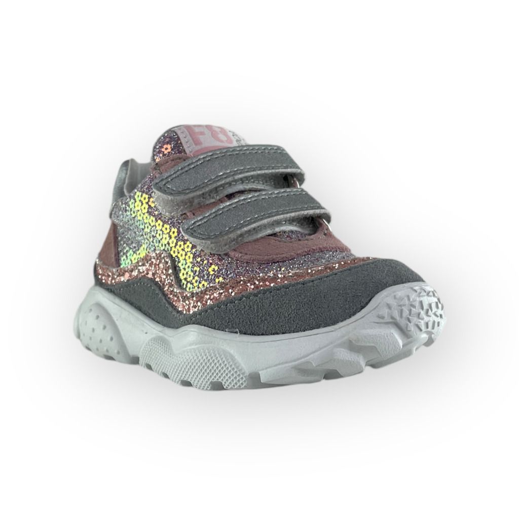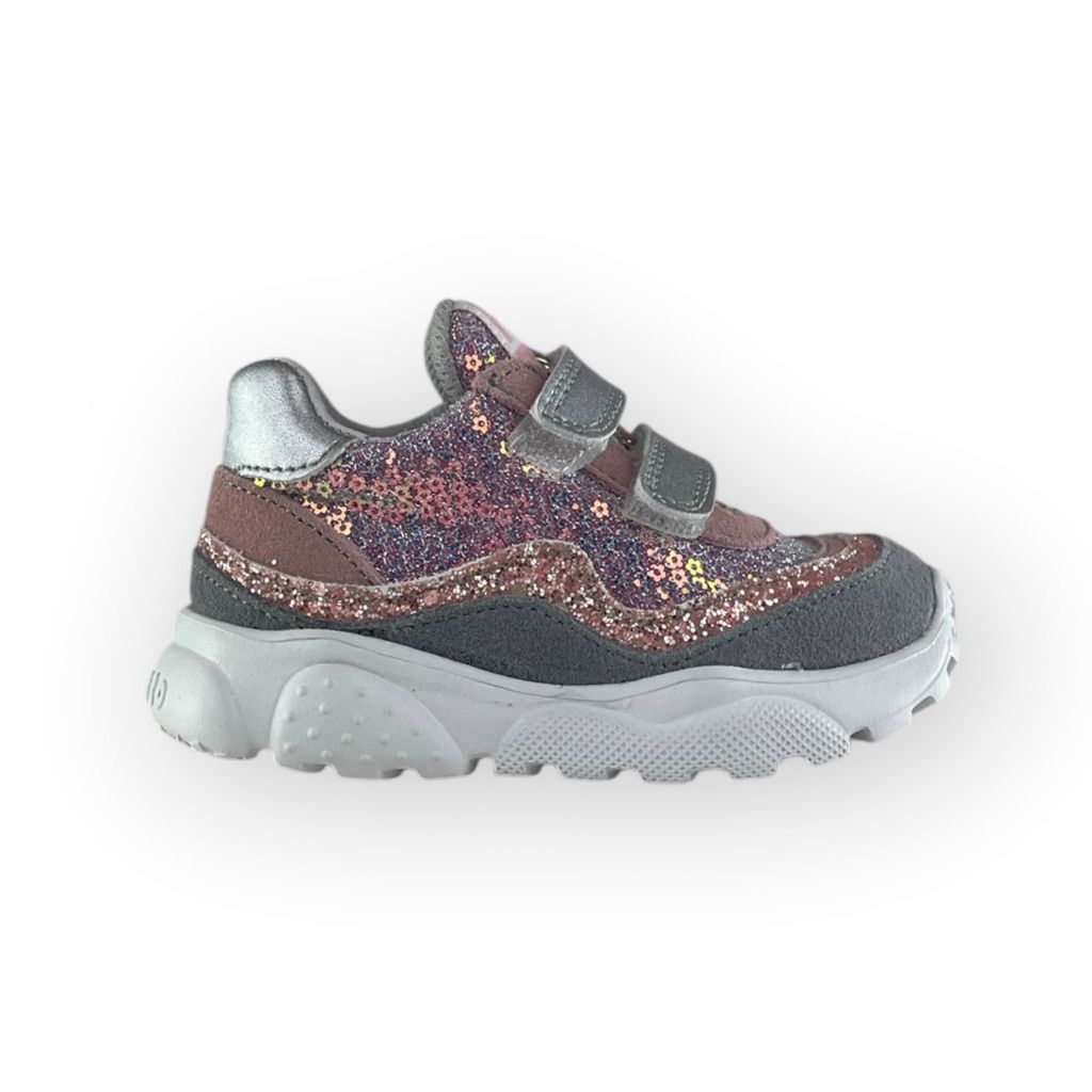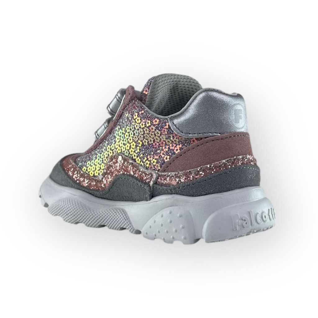 Bellissima scarpa primi passi della linea Falcotto. Una sneaker adatta per la salute dei piedi della tua bambina. Bello il colore rosa e grigio resi unici dai glitter.