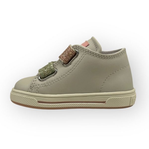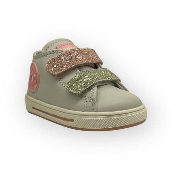 Scarpa con strappi glitterati della linea da bambina Falcotto. Perfetta per i primi passi della tua piccola grazie alla sua struttura sostenuta.
