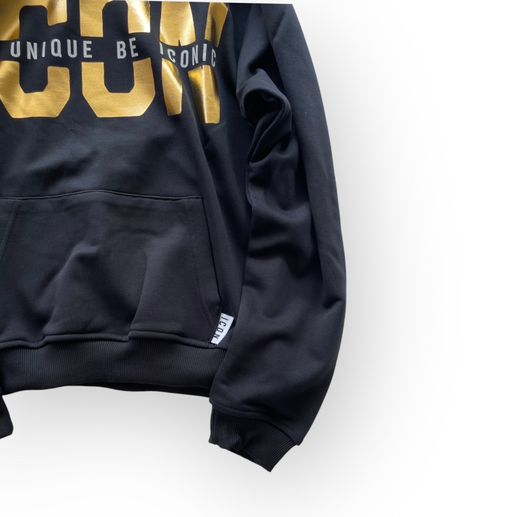 Moderna, grintosa e di grande stile, questa felpa nera con cappuccio della linea Icon è perfetta per i ragazzi che vogliono un look casual ma distintivo. Realizzata in 88% cotone leggero e 12% poliestere, garantisce morbidezza, comfort e traspirabilità, ideale per la scuola, lo sport o il tempo libero.