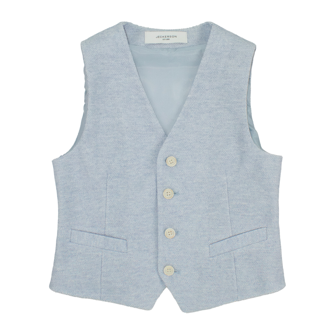 Il gilet da ragazzo colore cielo della linea Jeckerson è un capo elegante e luminoso, perfetto per completare look raffinati con un tocco di freschezza. Realizzato con materiali di qualità e rifinito con cura, offre una vestibilità comoda e impeccabile, ideale per cerimonie, eventi speciali o outfit più formali. Il delicato tono cielo dona modernità e stile, rendendo questo gilet un elemento distintivo nel guardaroba dei giovani che amano vestirsi con classe e ricercatezza.