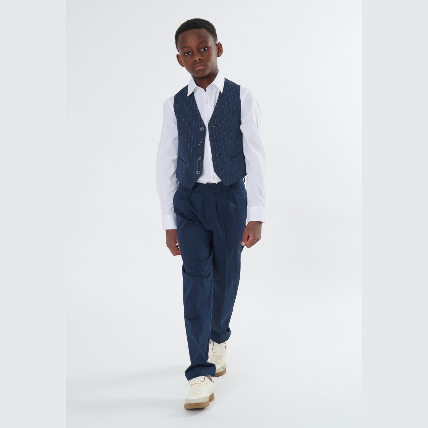 Il gilet elegante gessato blu da ragazzo della linea Jeckerson è il capo perfetto per completare outfit formali e look raffinati. Le sue sottili righe gessate conferiscono un tocco classico e sofisticato, ideale per cerimonie, occasioni speciali o abbinamenti più ricercati. Realizzato con materiali di qualità e progettato per offrire comfort e vestibilità impeccabile, questo gilet aggiunge stile e personalità a ogni completo, diventando un must-have nel guardaroba dei giovani che amano vestirsi con eleganza.