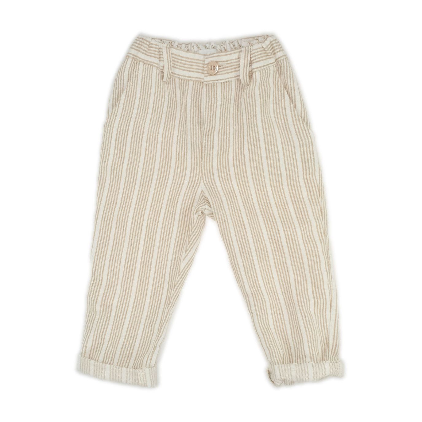 Pantalone a righe colore beige in lino per una sensazione di freschezza e leggerezza che andrโ€ฆ ad arricchire l’ outfit del tuo bambino.nnMATERIALE: 50% lino, 30% cotone, 20% poliestere.