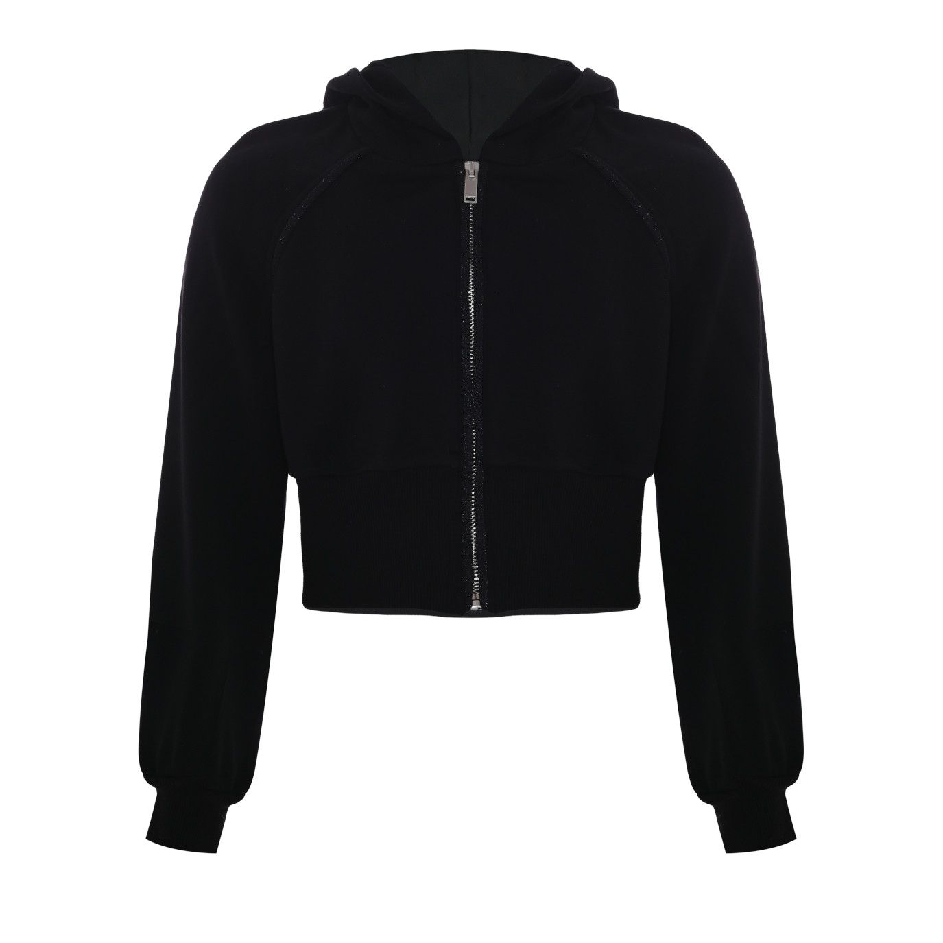 Felpa corta di colore nero con zip e cappuccio da bambina della linea Kocca.