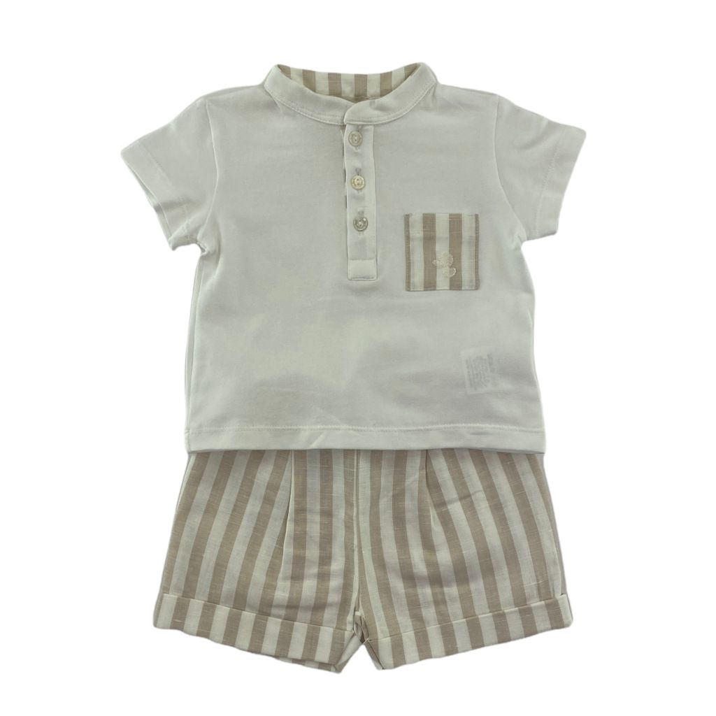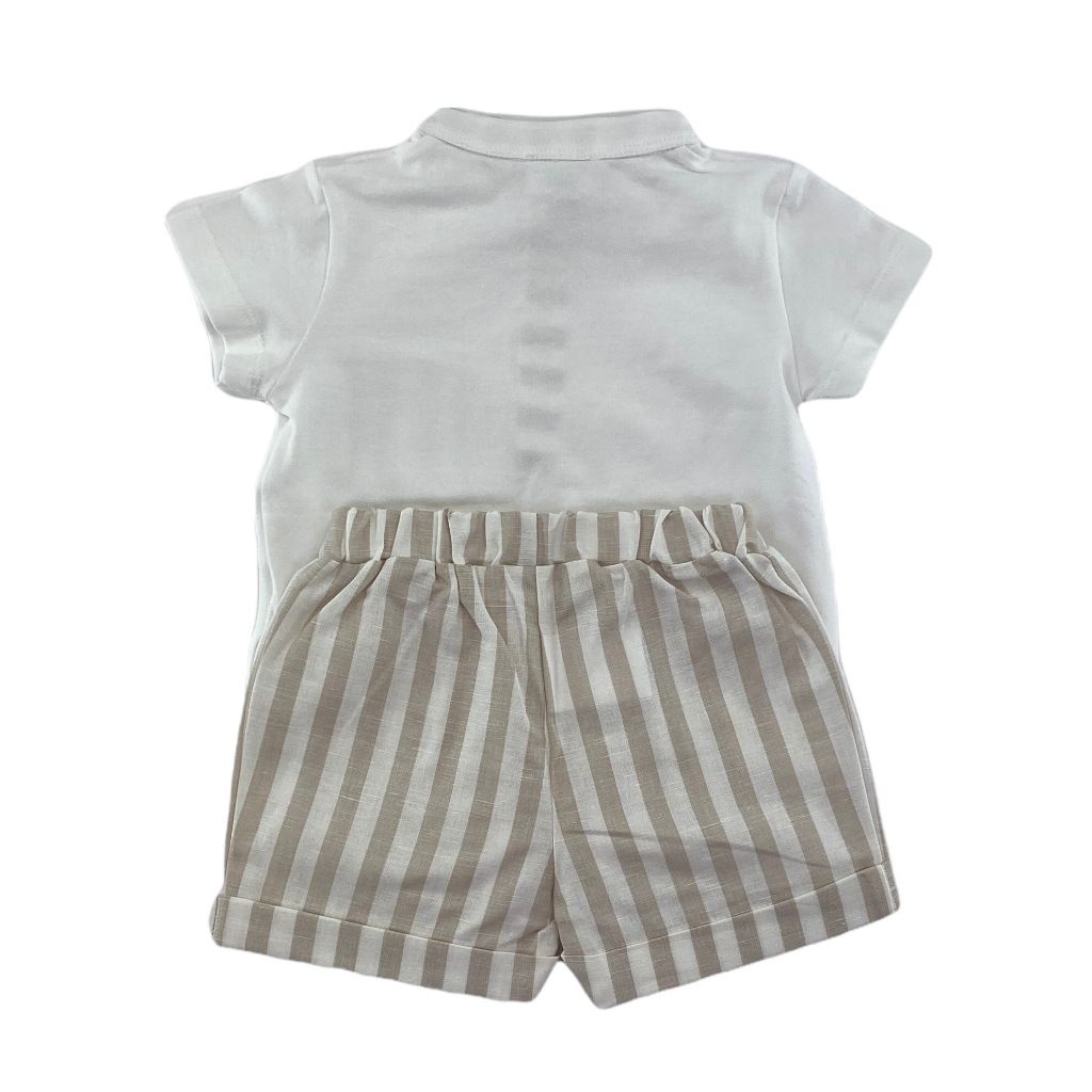 Ed ecco che per i vostri piccolini, Lalal— nella linea baby ci presenta un comodo e versatile completino. Grazie alle rifiniture rigate sui toni del panna e del sabbia all’interno del colletto a coreana e nel taschino, questa t-shirt Š perfetta anche per rivestire il bambino. Ovviamente i dettagli della t-shirt richiamano il bermuda di lino rigato.nnMATERIALE: 92% cotone, 8% elastane.n55% lino, 45% cotone.n