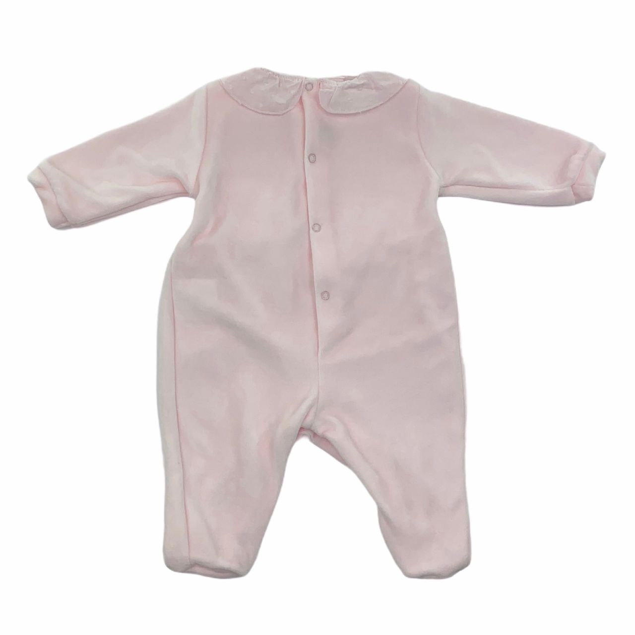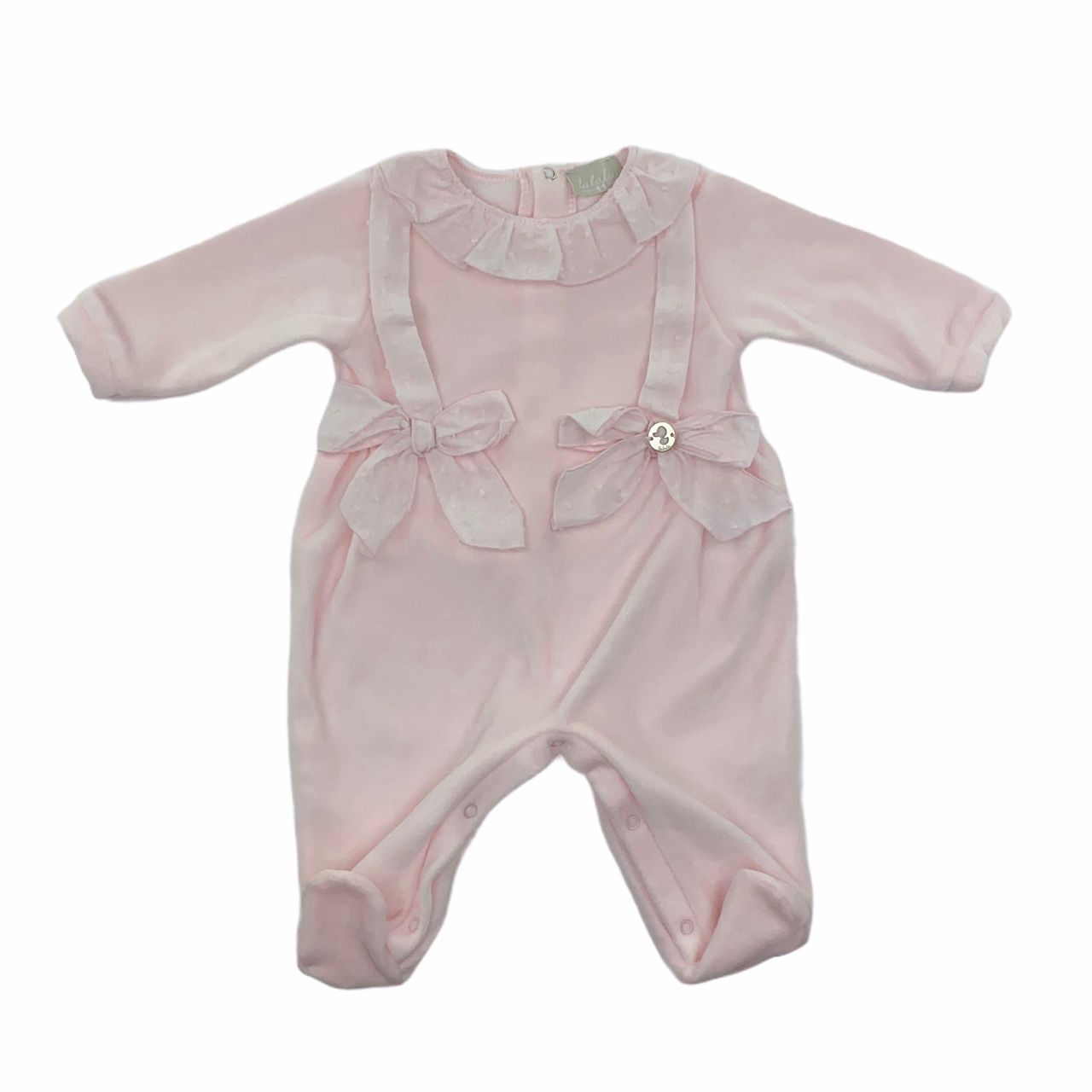 Tutina intera rosa con fiocchi applicati in ciniglia. Il colore rosa Š un classico nell’ outfit delle appena nate che si faranno cullare da questi materiali soffici e comodi.nnMATERIALE: 80% cotone, 20% poliestere.