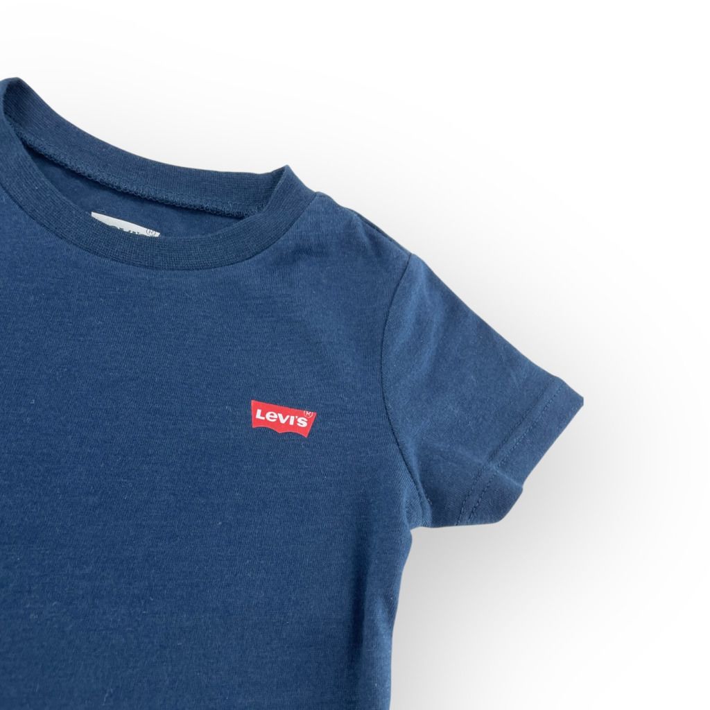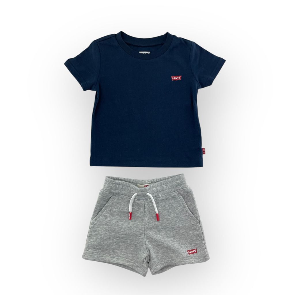 Completo corto due pezzi, bermuda in cotone di colore grigio e t-shirt di colore blu da bambino della linea Levi’s baby.
