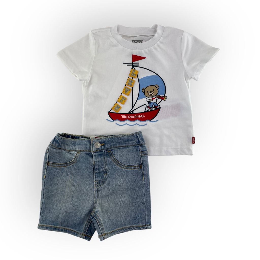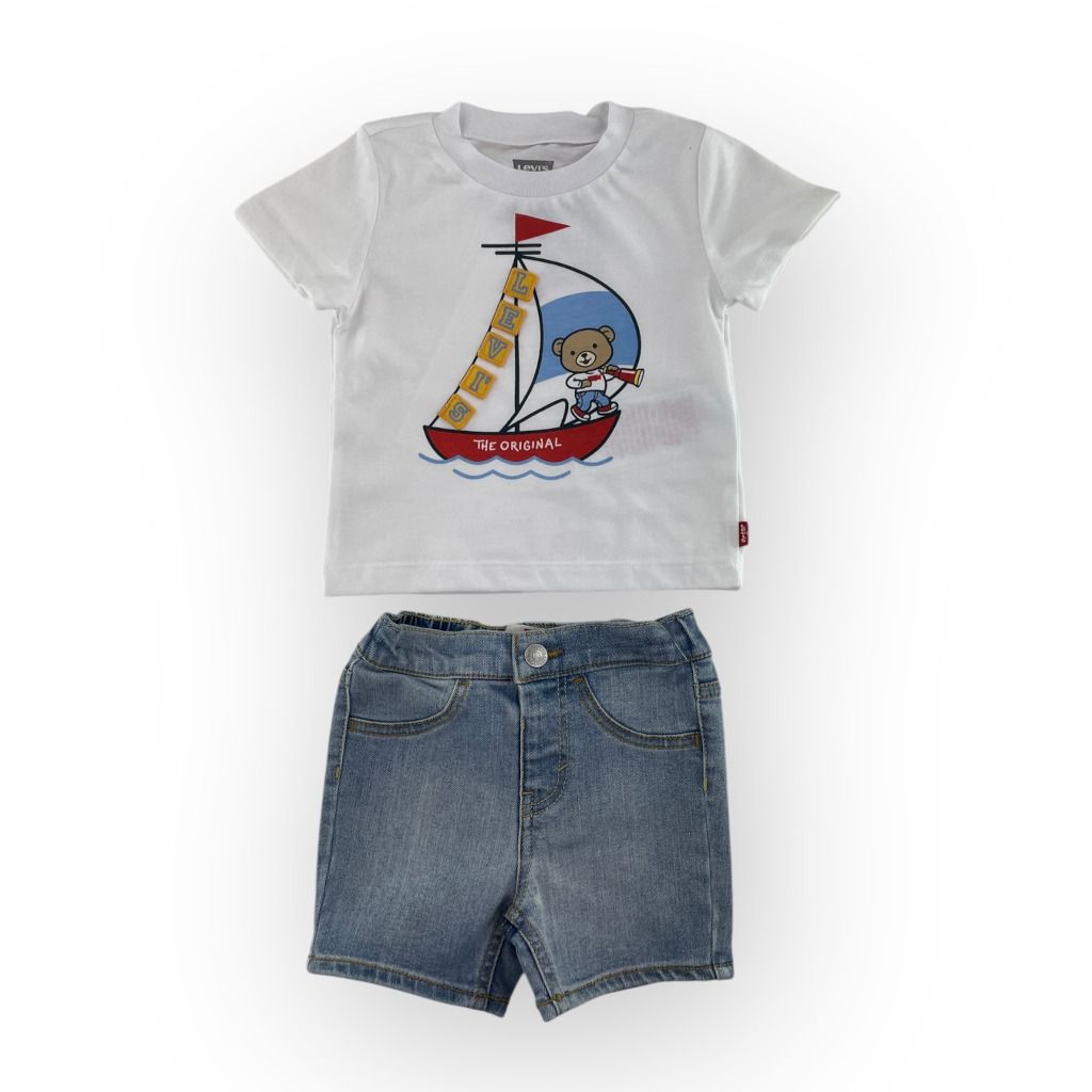 Bellissimo completo composto da t-shirt bianca e bermuda in jeans. La linea Levi’s bambino si conferma perfetta per outfit comodi e per tutti i giorni.n