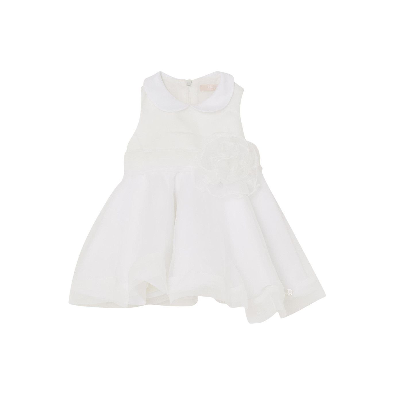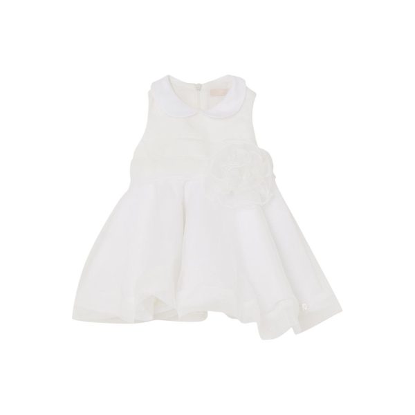 Abito svasato, in organza bianca con fascia in vita. Sulla fascia ล applicato un meraviglioso fiore che regala al capo un tocco di raffinatezza. La sua eleganza lo rende ideale per cerimonie, battesimi e matrimoni.nnMATERIALE: 100% poliestere.