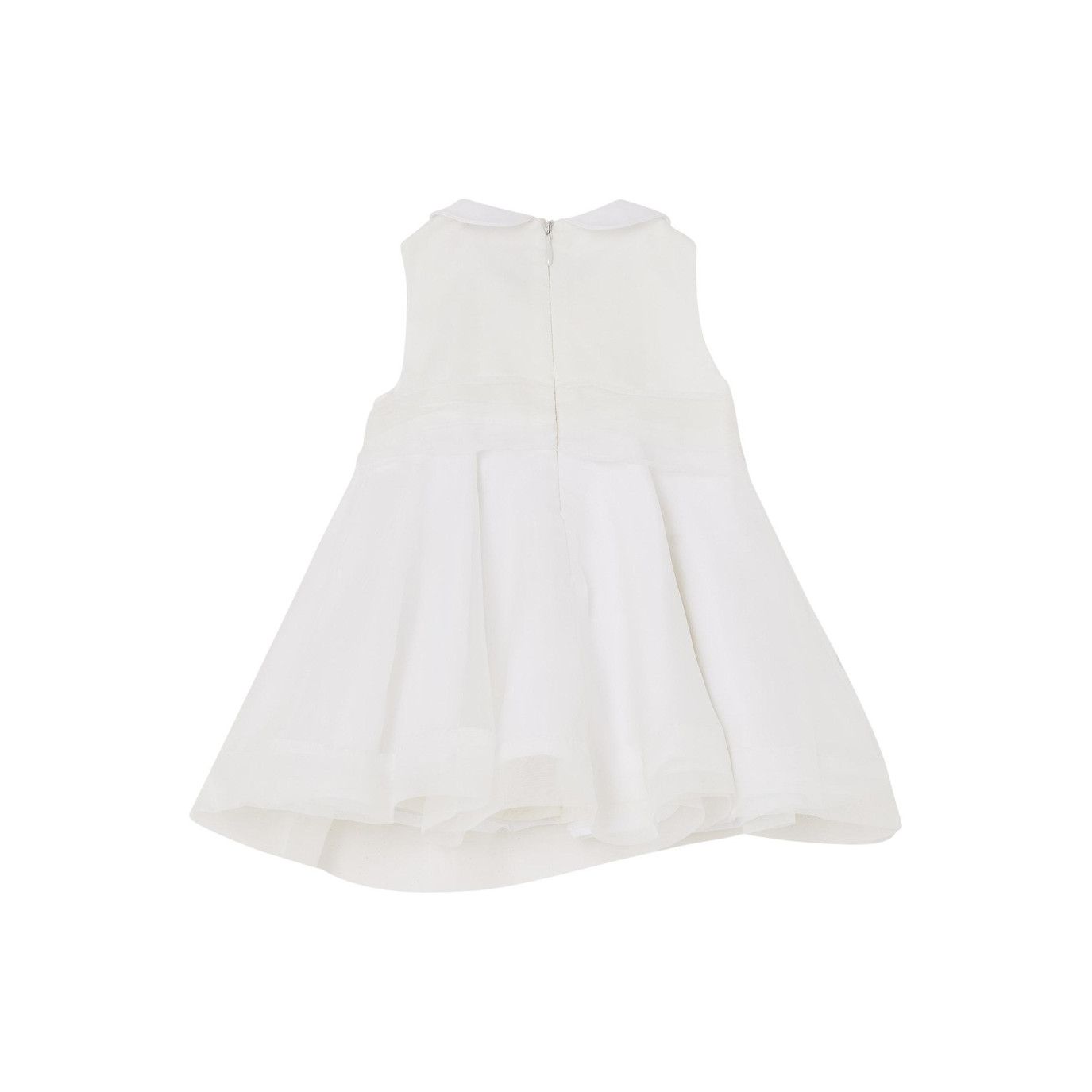 Abito svasato, in organza bianca con fascia in vita. Sulla fascia ล  applicato un meraviglioso fiore che regala al capo un tocco di raffinatezza. La sua eleganza lo rende ideale per cerimonie, battesimi e matrimoni.nnMATERIALE: 100% poliestere.
