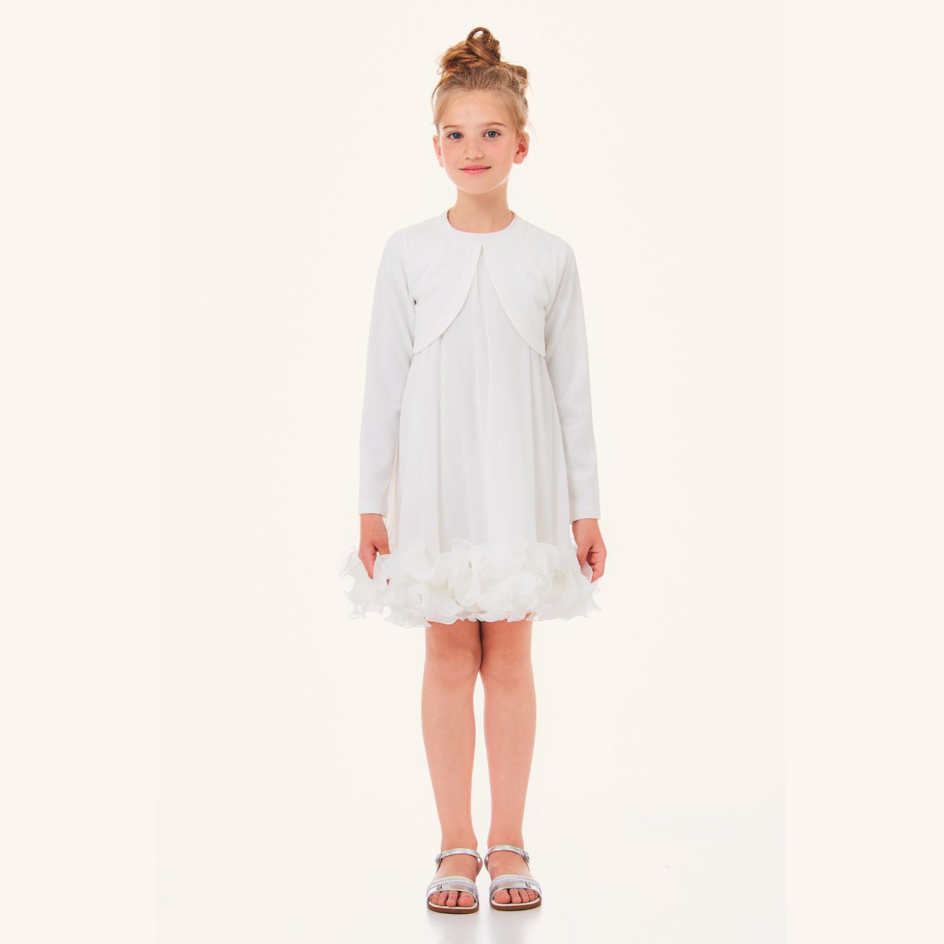 Abito bianco con rouche sul fondo, dotato di eleganza e semplicitร che lo rendono ideale per comunioni e cerimonie.