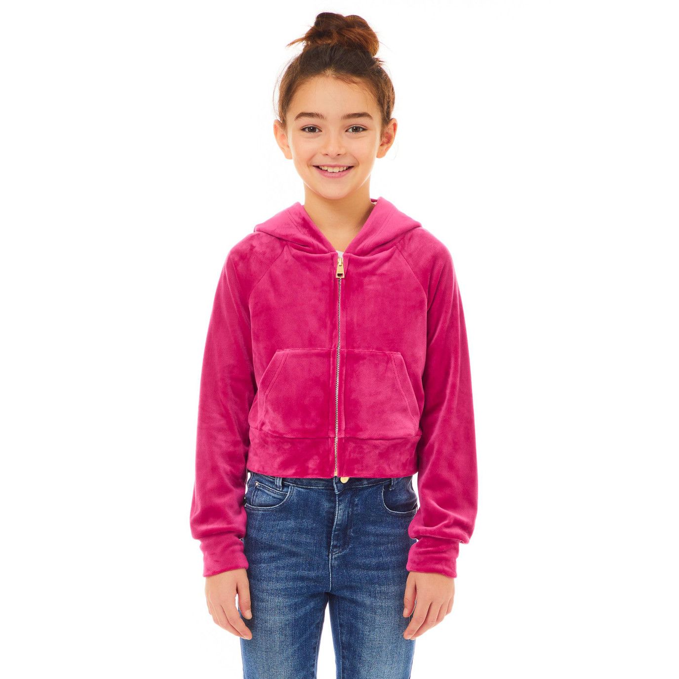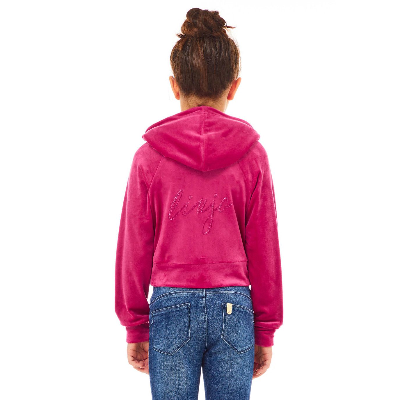 Felpa corta aperta a zip di colore fuxia in ciniglia da bambina della linea Liu Jo.