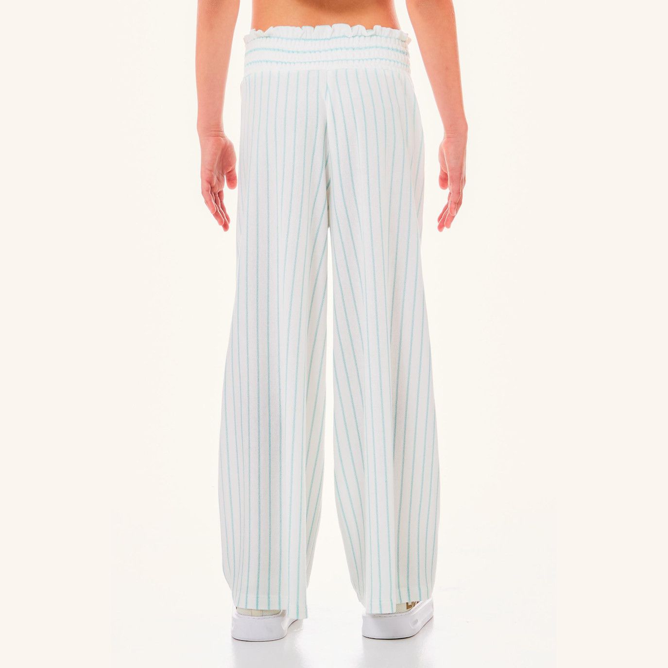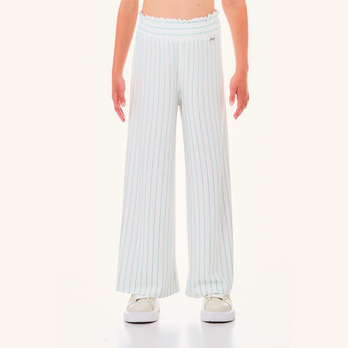 Pantalone in morbido jersey di colore bianco con riga verticale tiffany. Un pantalone morbido e leggero, perfetto per le temperature estive.nnMATERIALE:97% viscosa 2% poliestere.
