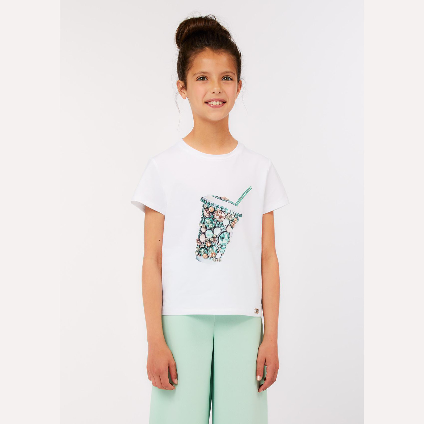 La stampa del bicchiere, originale e trendy, aggiunge un tocco divertente che rende il capo ideale per look casual e versatili, perfetti per la scuola e il tempo libero.