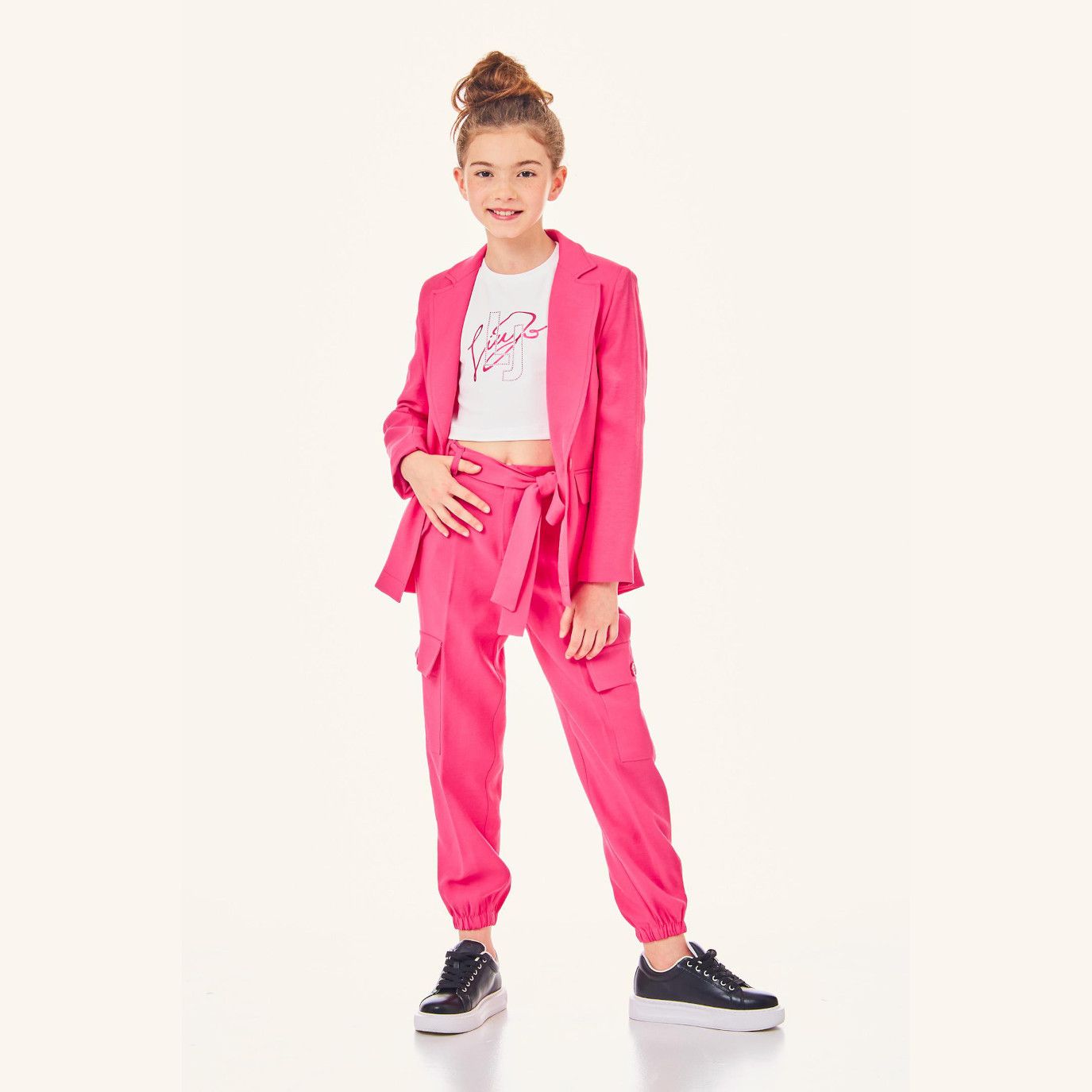 T-shirt cropped a manica corta con stampa Liu.Jo di colore fuxia. Disponibile anche nel colore nero ล  abbinabile sia su un capo casual e giornaliero, sia su un completo piโ€” elegante. nMATERIALE: 95% cotone 5% elastan.