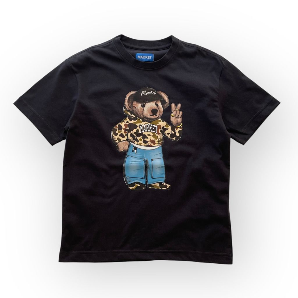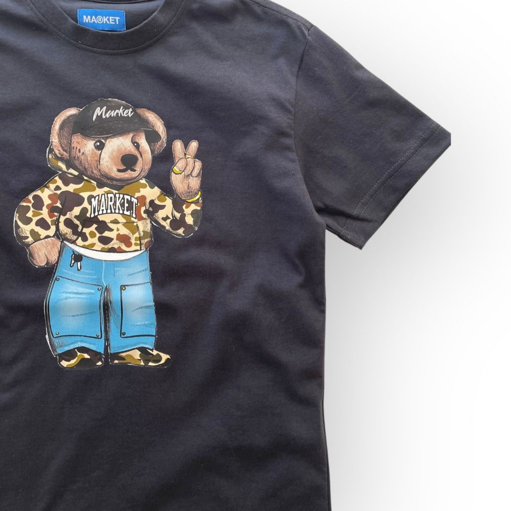 T-shirt mezza manica di colore nero con stampa orso mimetico con logo Market da ragazzo.