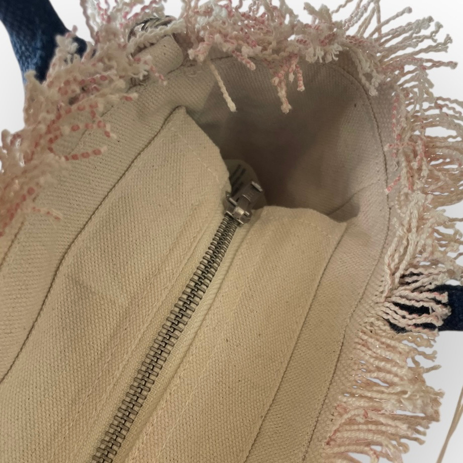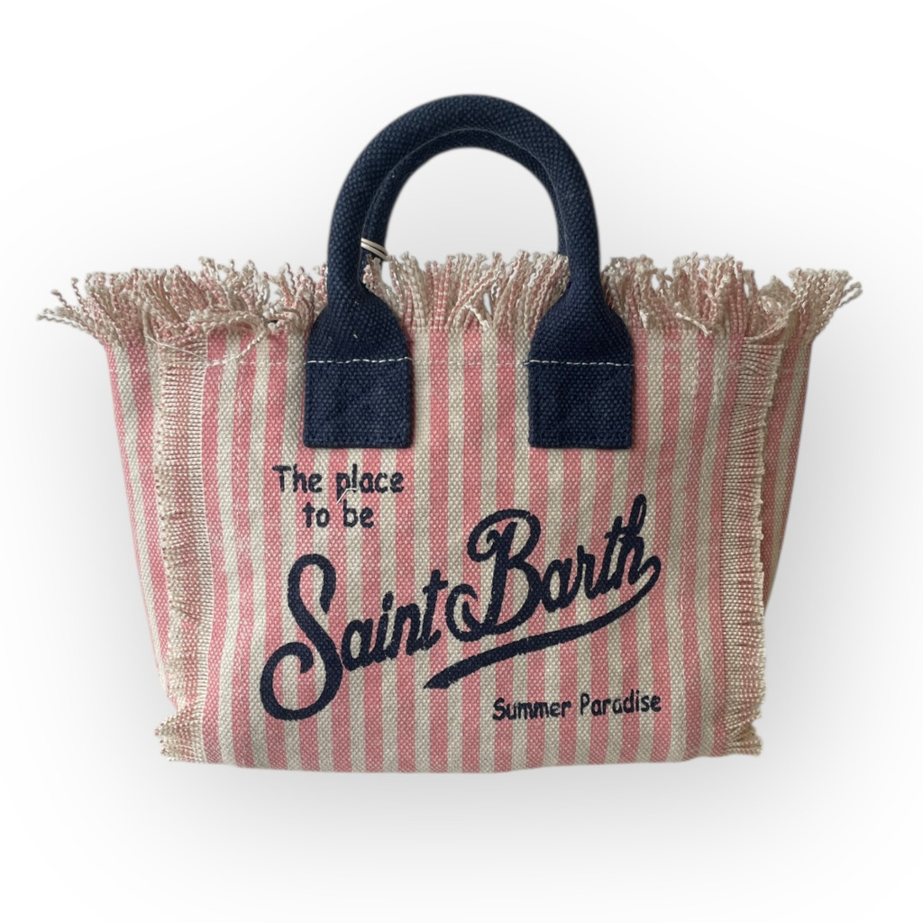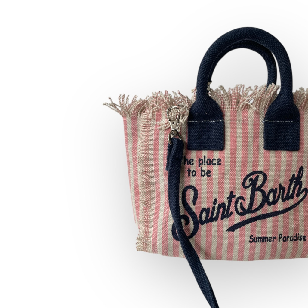 Scopri la Vanity Mini di MC2 Saint Barth nella vivace fantasia a righe rosa e bianche con scritta blu, un accessorio fresco e giocoso perfetto per la stagione estiva. Realizzata in cotone di alta qualità, questa mini bag dalle dimensioni 20x15x8 cm combina stile, leggerezza e funzionalità, diventando l’alleata ideale per ogni outfit casual-chic.