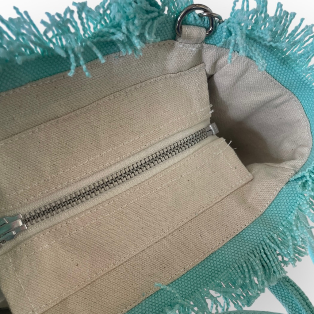 Ideale per la stagione estiva, vacanze, giornate al mare o passeggiate in città, la Vanity Mini tiffany con scritta bianca è il must-have perfetto per chi ama accessori trendy, luminosi e dallo stile inconfondibile.