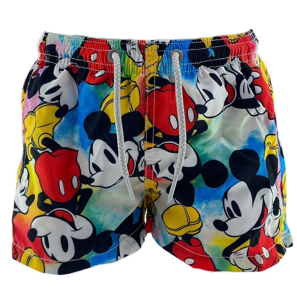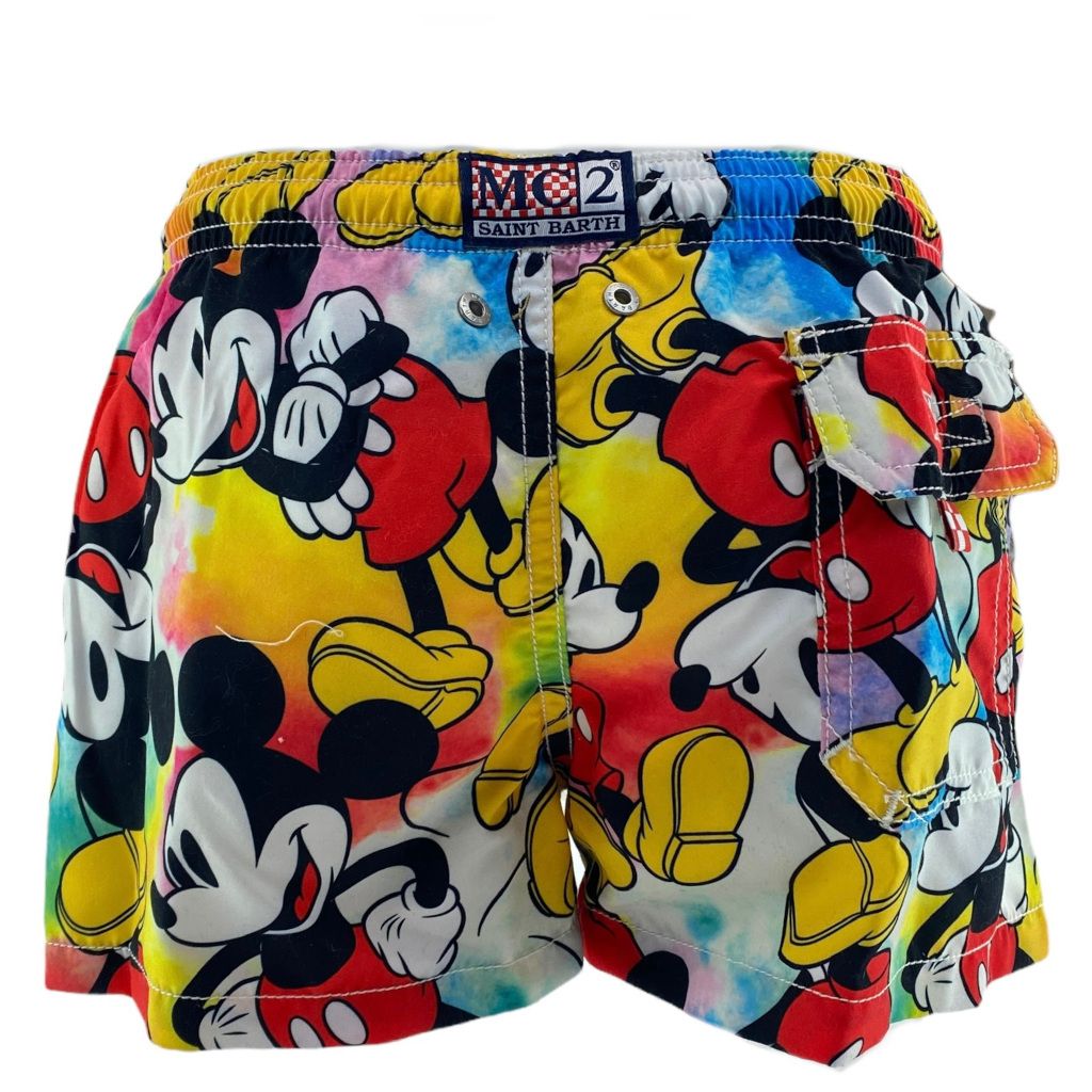 Costume mare da bambino targato MC2 Saint Barth. La stampa topolino fa innamorare grandi e piccoli. Lo sfondo ล super colorato in fantasia tie dye. nnMATERIALE: 100% poliestere.