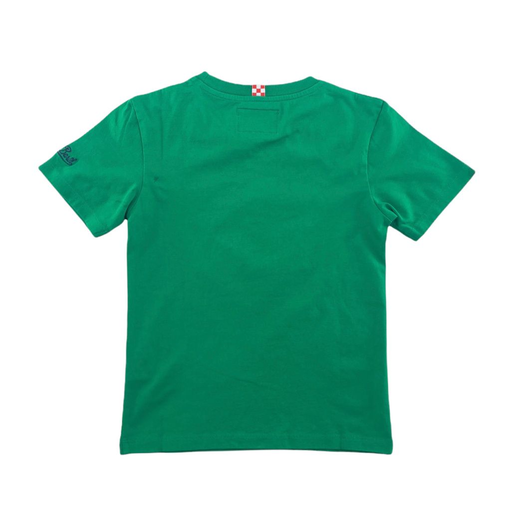 T-shirt manica corta della linea Saint Barth bambino. Stampa con squalo su sfondo verde bottiglia. Nella taglia 2 anni la t-shirt ล  chiusa dai bottoni al lato del collo. nnMATERIALE: 100% cotone.