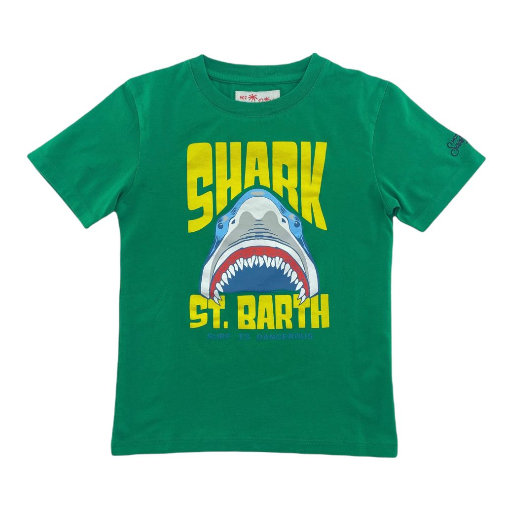 T-shirt manica corta della linea Saint Barth bambino. Stampa con squalo su sfondo verde bottiglia. Nella taglia 2 anni la t-shirt ล  chiusa dai bottoni al lato del collo. nnMATERIALE: 100% cotone.