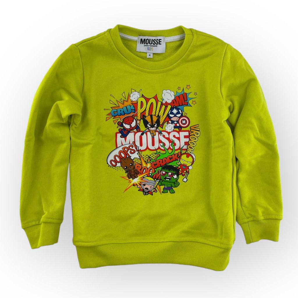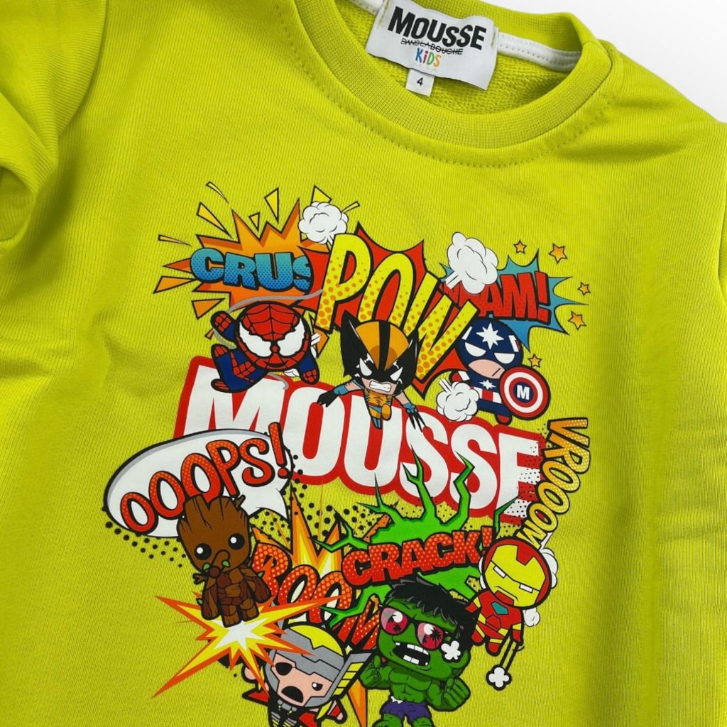| Info Prodotto | Felpa girocollo gialla con stampa Avengers della linea Mousse. |