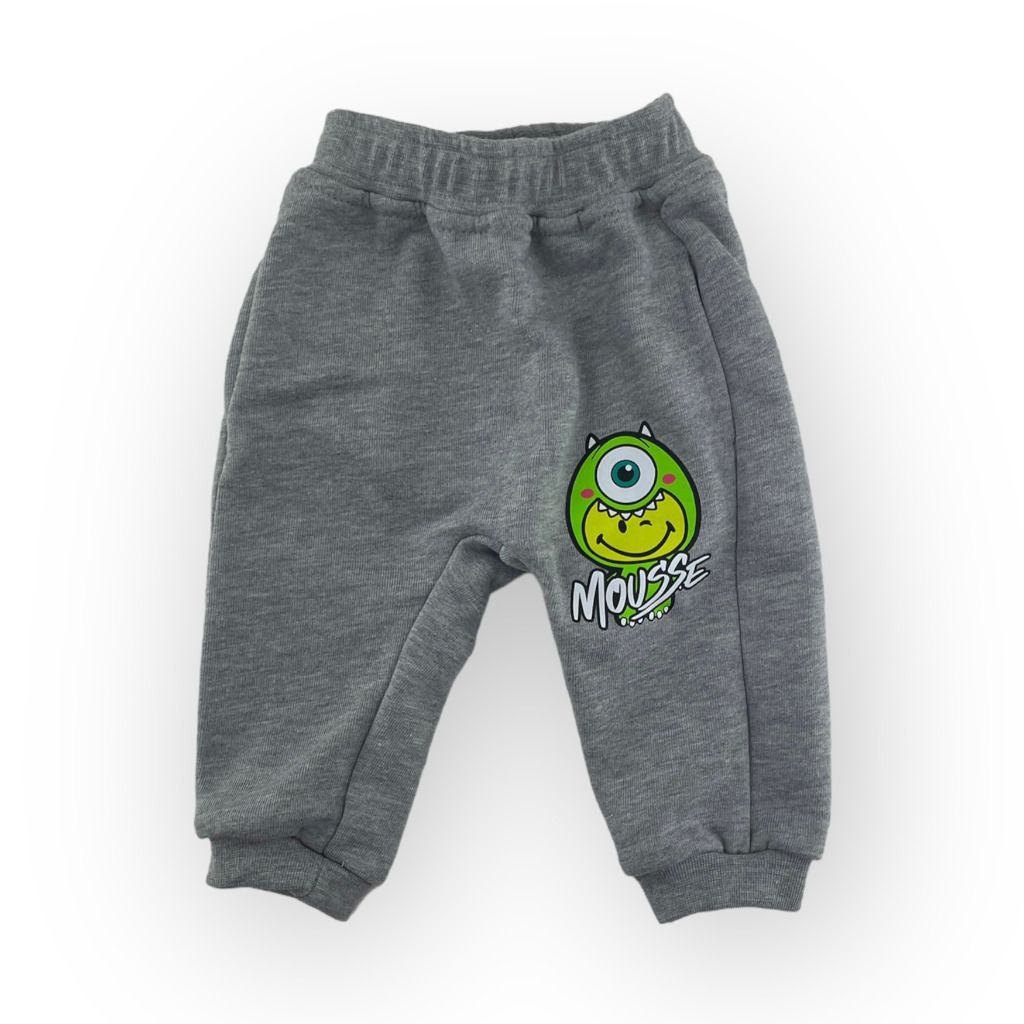 Pantalone in cotone leggero della linea baby Mousse. Bella la stampa Monster su fondo grigio.