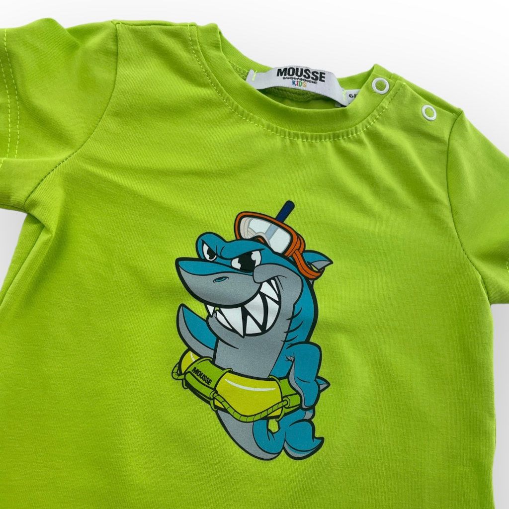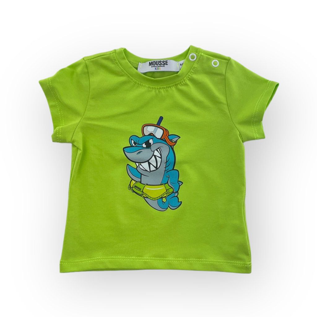 T-shirt manica corta di colore verde con stampa squalo, della linea baby. Una t-shirt morbida e versatile, perfetta per la stagione estiva.