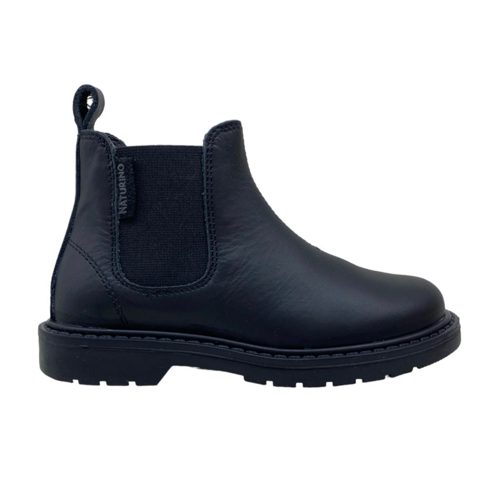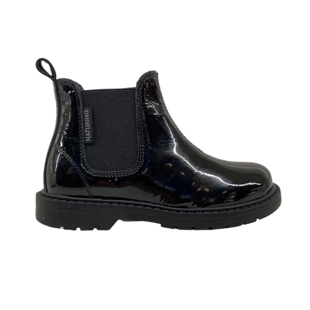 Beatles nero della linea da bambini di Naturino. Classico stivaletto versatile da indossare in qualsiasi occasione. Disponibile nero e nero laccato. Il numero 27 presenta la targhetta circolare con la n di Naturino.