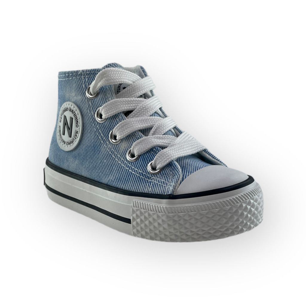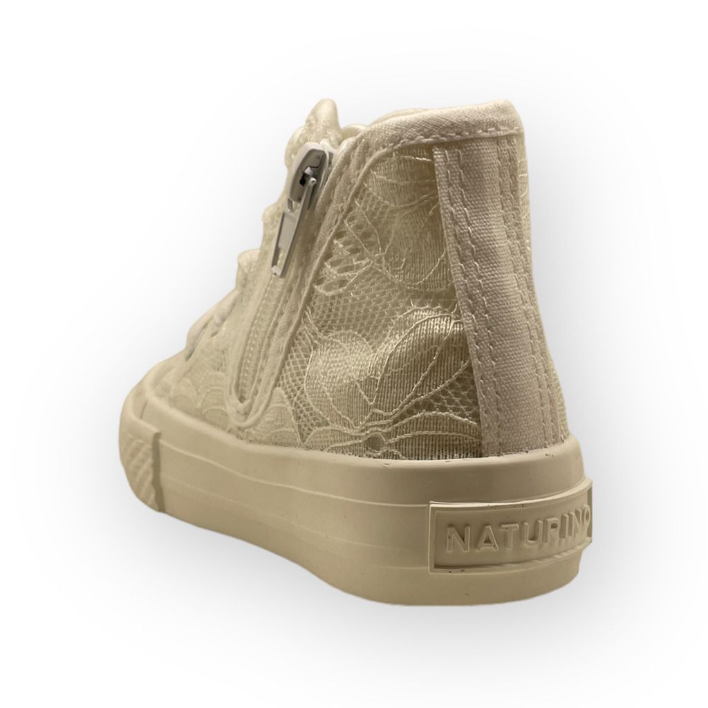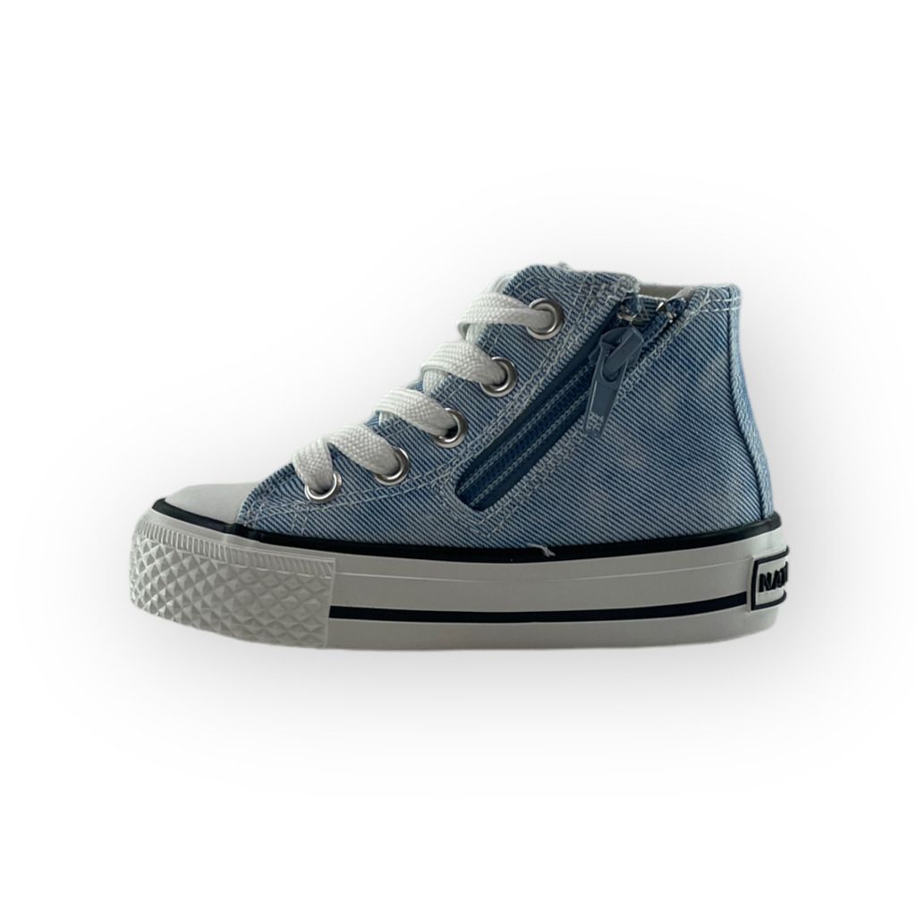 Scarpa alta di tela con lacci e zip laterale per facilitare la calzata.