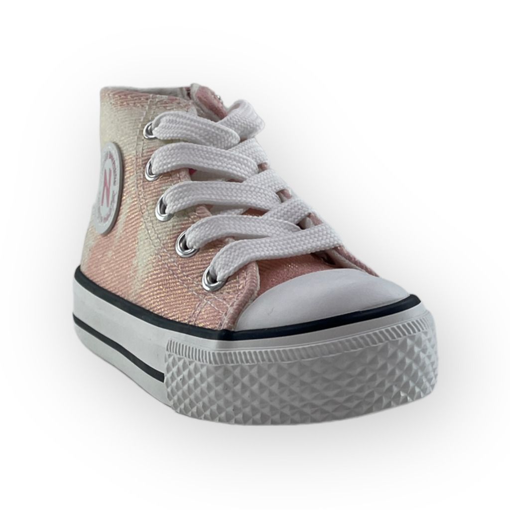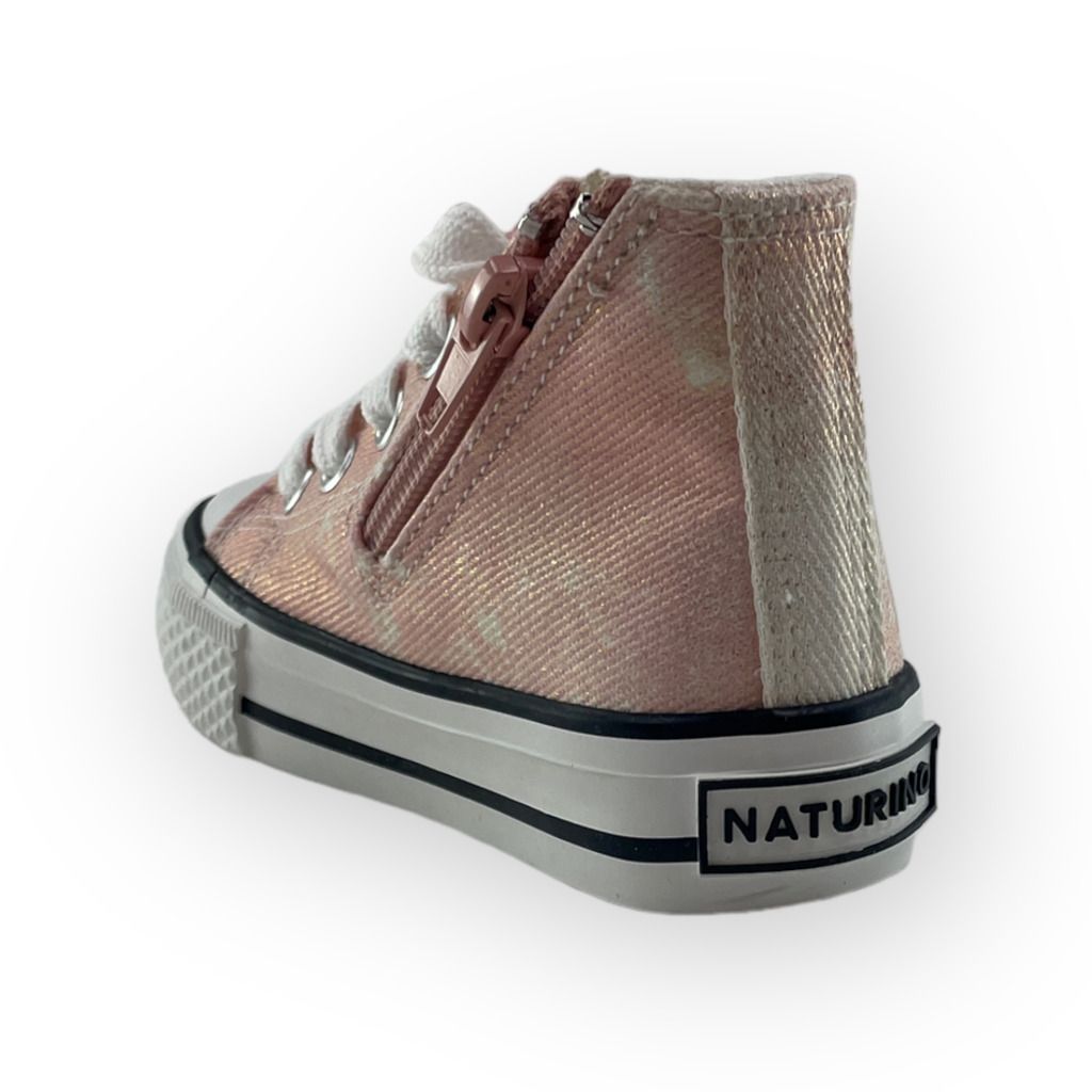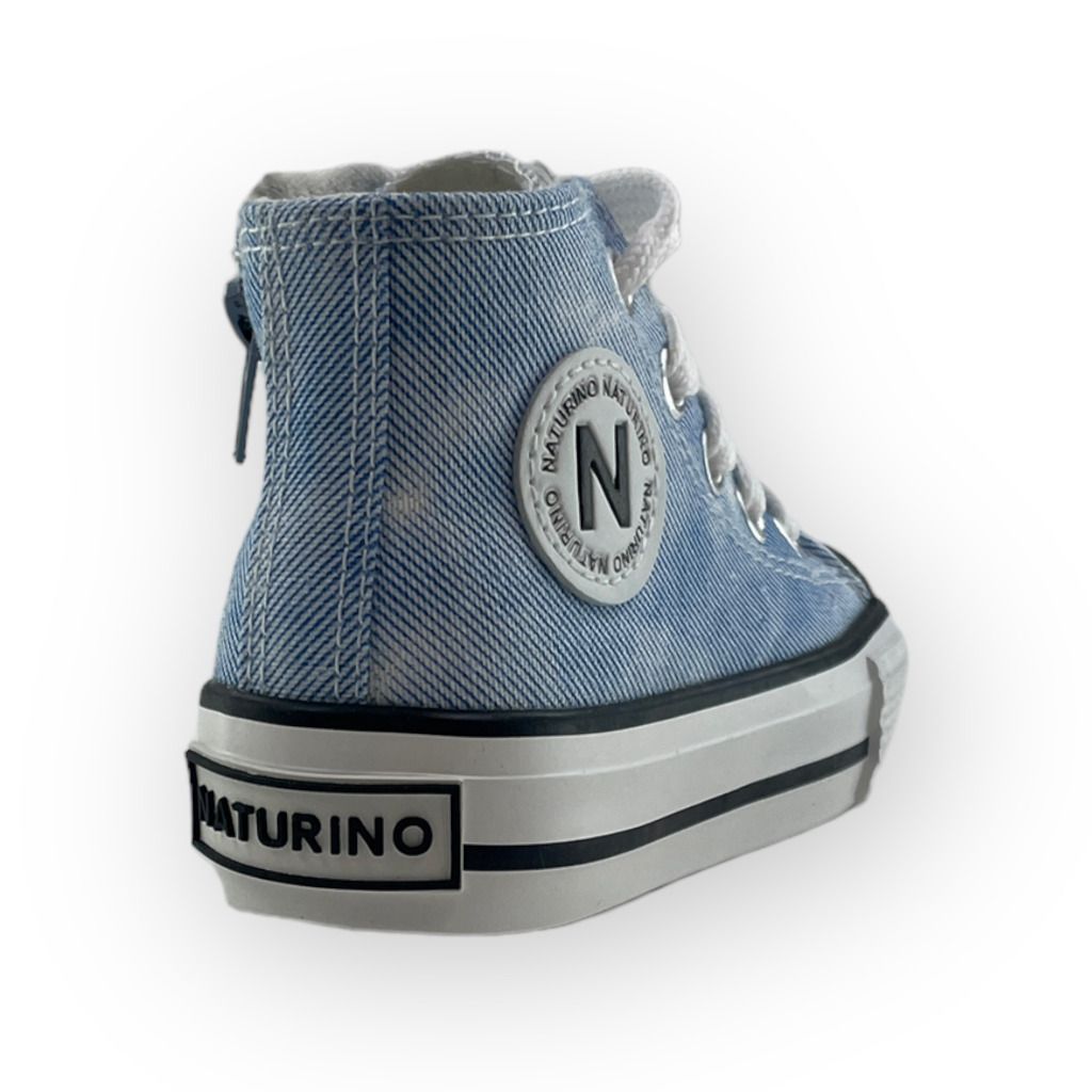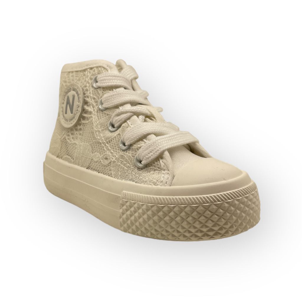 Scarpa alta di tela con lacci e zip laterale per facilitare la calzata.