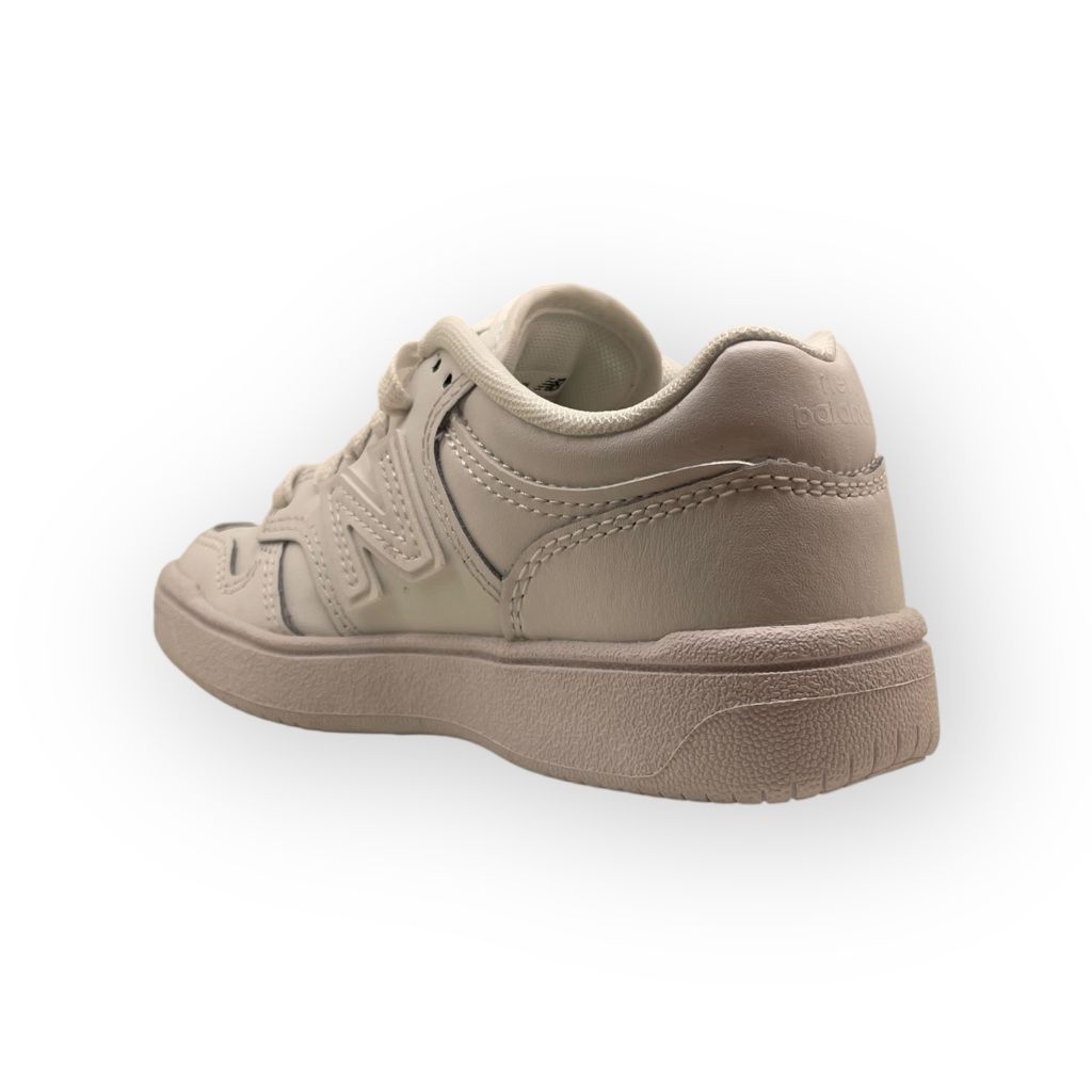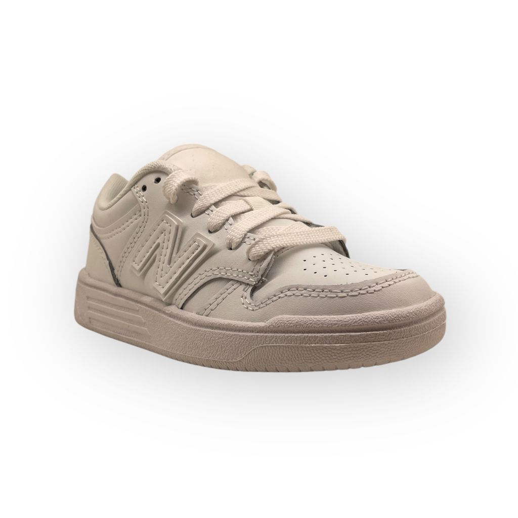 Scarpa New Balance bianca con lacci in ecopelle nei numeri dal 28 al 35.