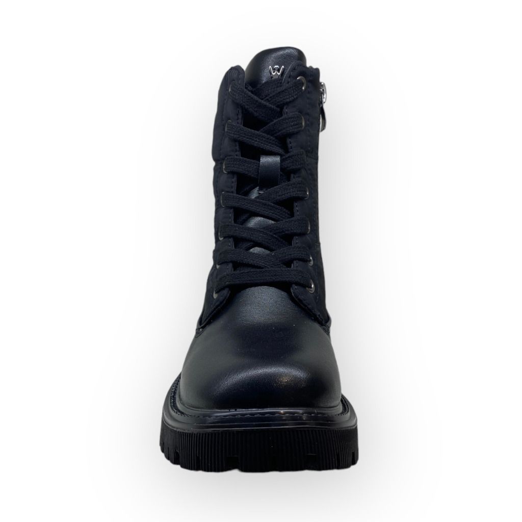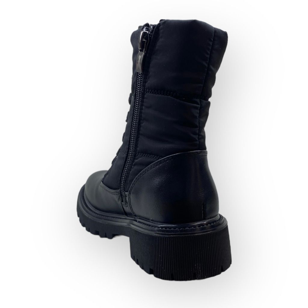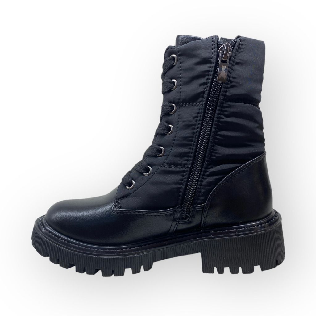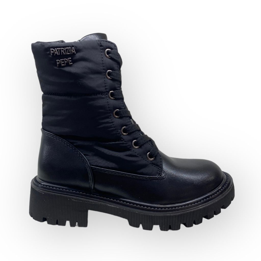 Anfibio nero della linea da bambina Patrizia Pepe con lacci e materiale in nylon che crea una fisionomia pulita.