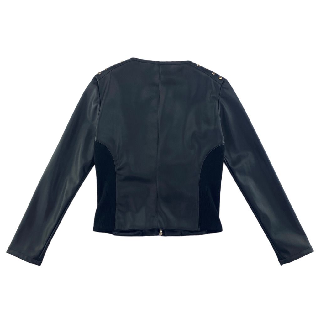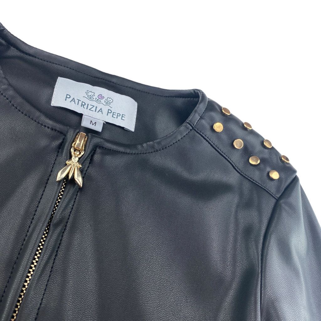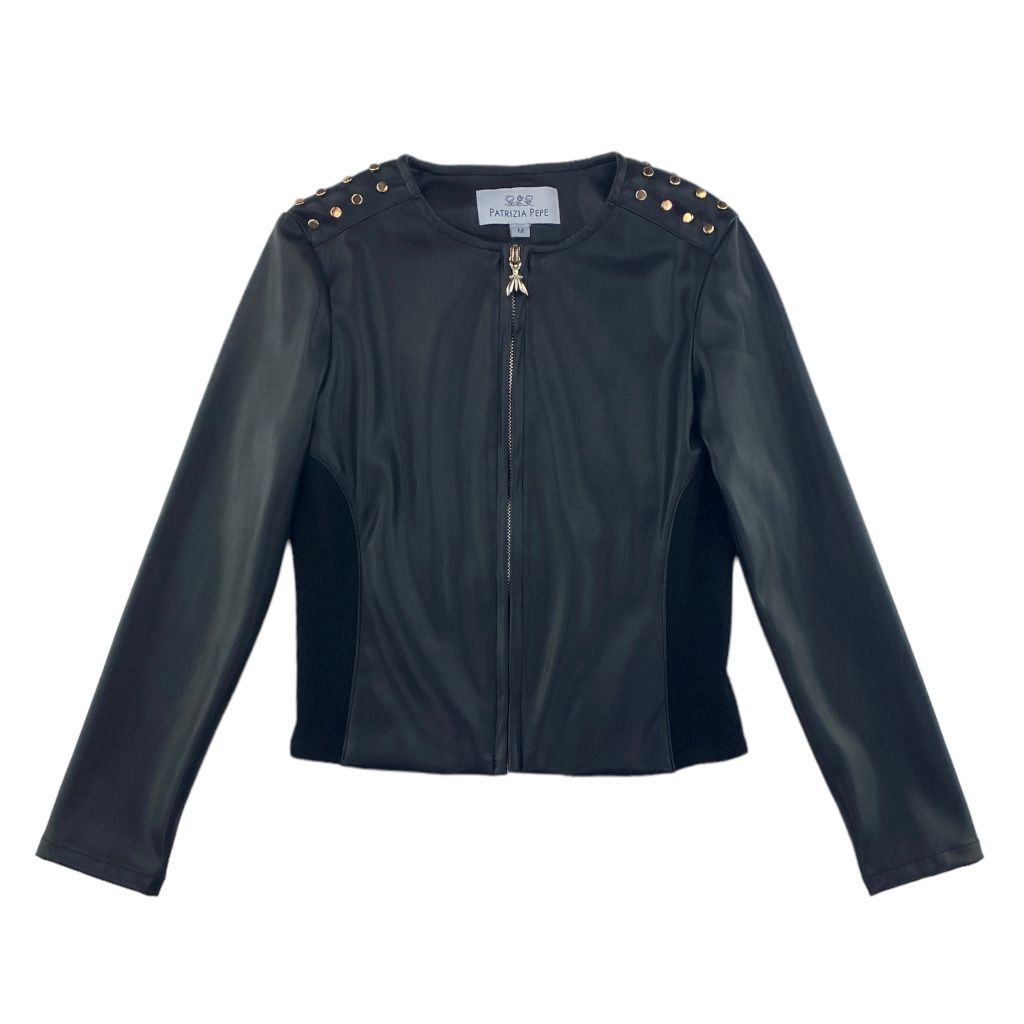 Giubbottino di ecopelle modello biker della linea Junior di Patrizia Pepe. Sulle spalle le borchiette oro donano luce al viso. Il modellino ล corto e avvitato, per renderlo piโ comodo ci sono degli inserti elastici ai lati.nnMATERIALE: 100% poliuretano. 100% poliestere.nFodera 55% poliestere, 45% viscosa.nInserto 50% cotone, 50% poliestere.
